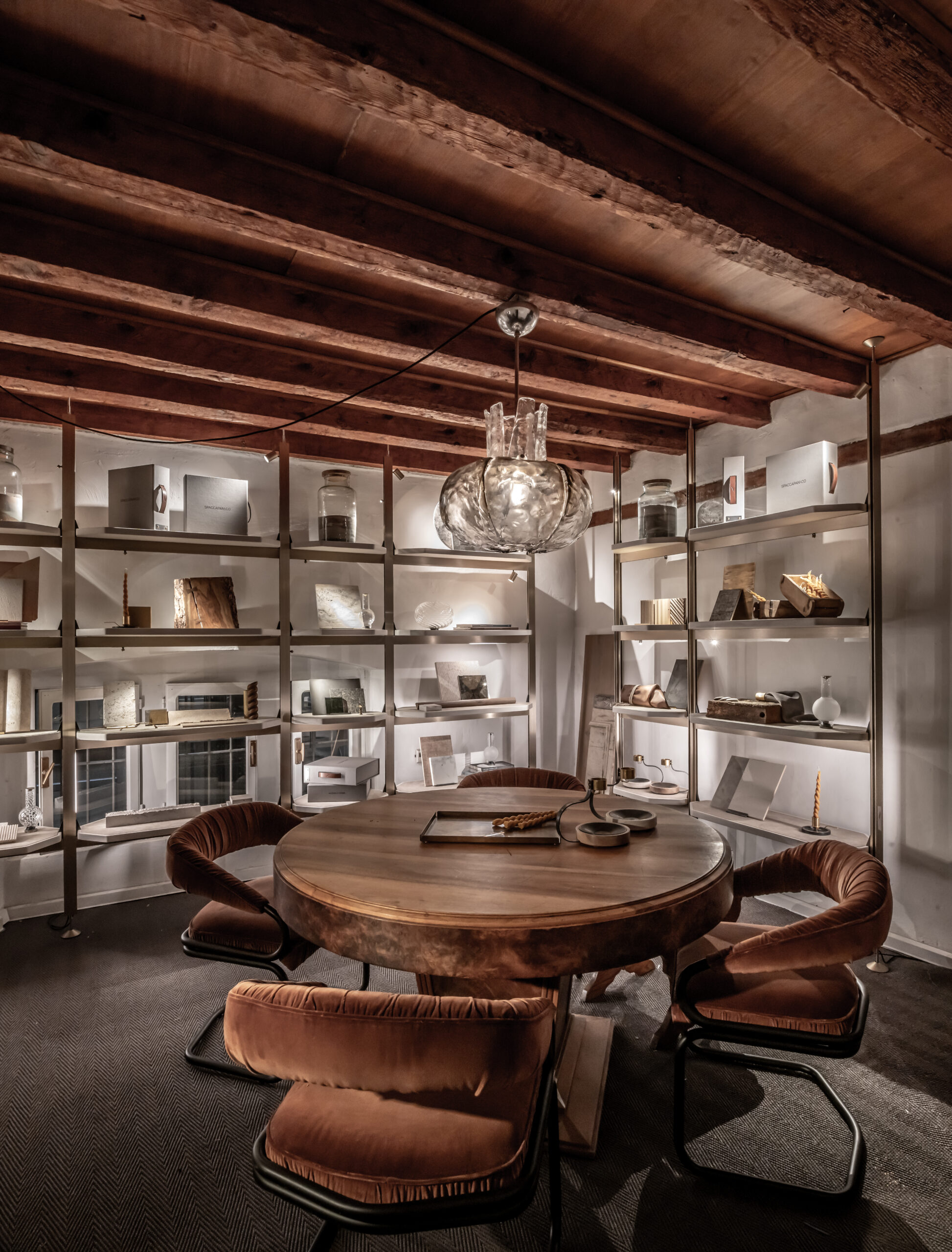 Ascending to the third room, one feels as though they are entering a glassware workshop, where the proportion between the workbench and the light highlights the care and respect involved in the creation process. Our brand emphasizes the importance of balancing materials and treating light as a precious asset, inviting reflection on the value of craftsmanship born from dedication and attention to detail.