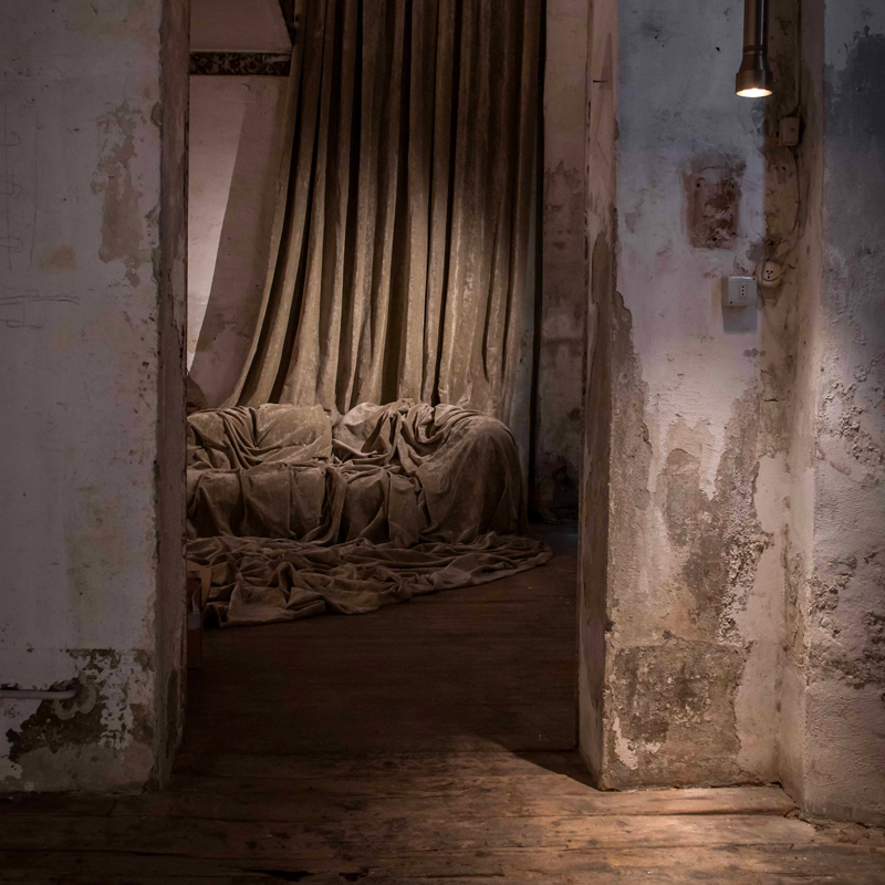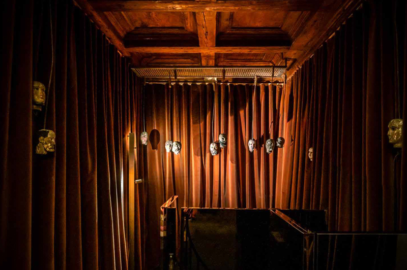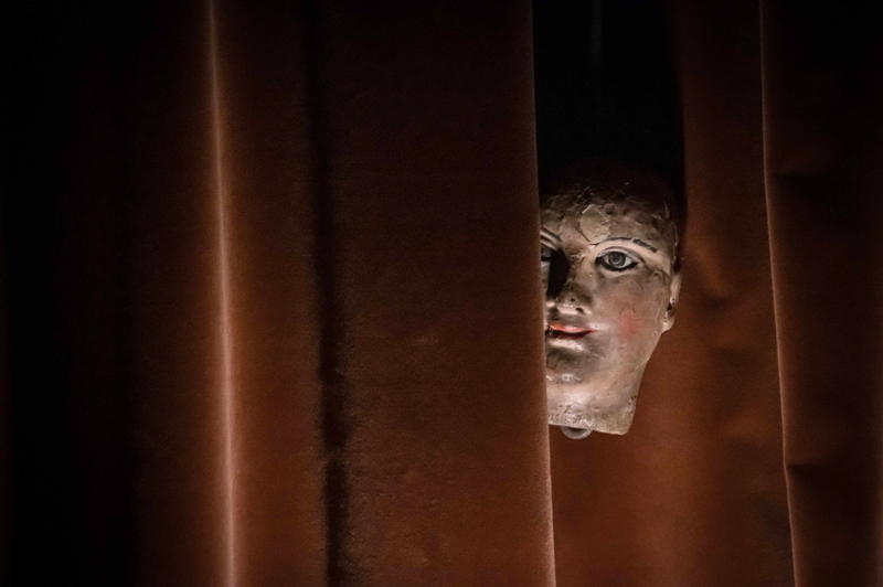 In the fifth scene of the corridor before entering the material library, we catch glimpses of the many faces and facets that projects can have. 18th-century marionette heads impress the viewer and invite curiosity.