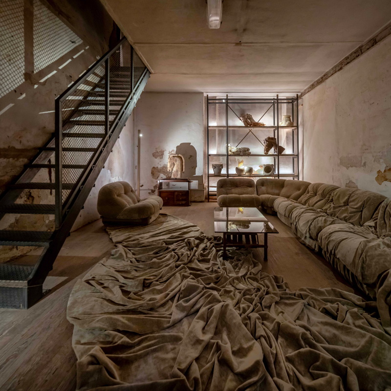 Continuing into the second room, the space is filled with linen velvet, chosen for its interplay of light and shadow, enveloping it in refined comfort while celebrating our artisanal knowledge. In our Emporium of Assisi, a timeless collection of Italian and European design, from the 1600s to today, creates a silent dialogue between past and present, uniting busts and capitals from the 19th century with pieces from the 1950s.