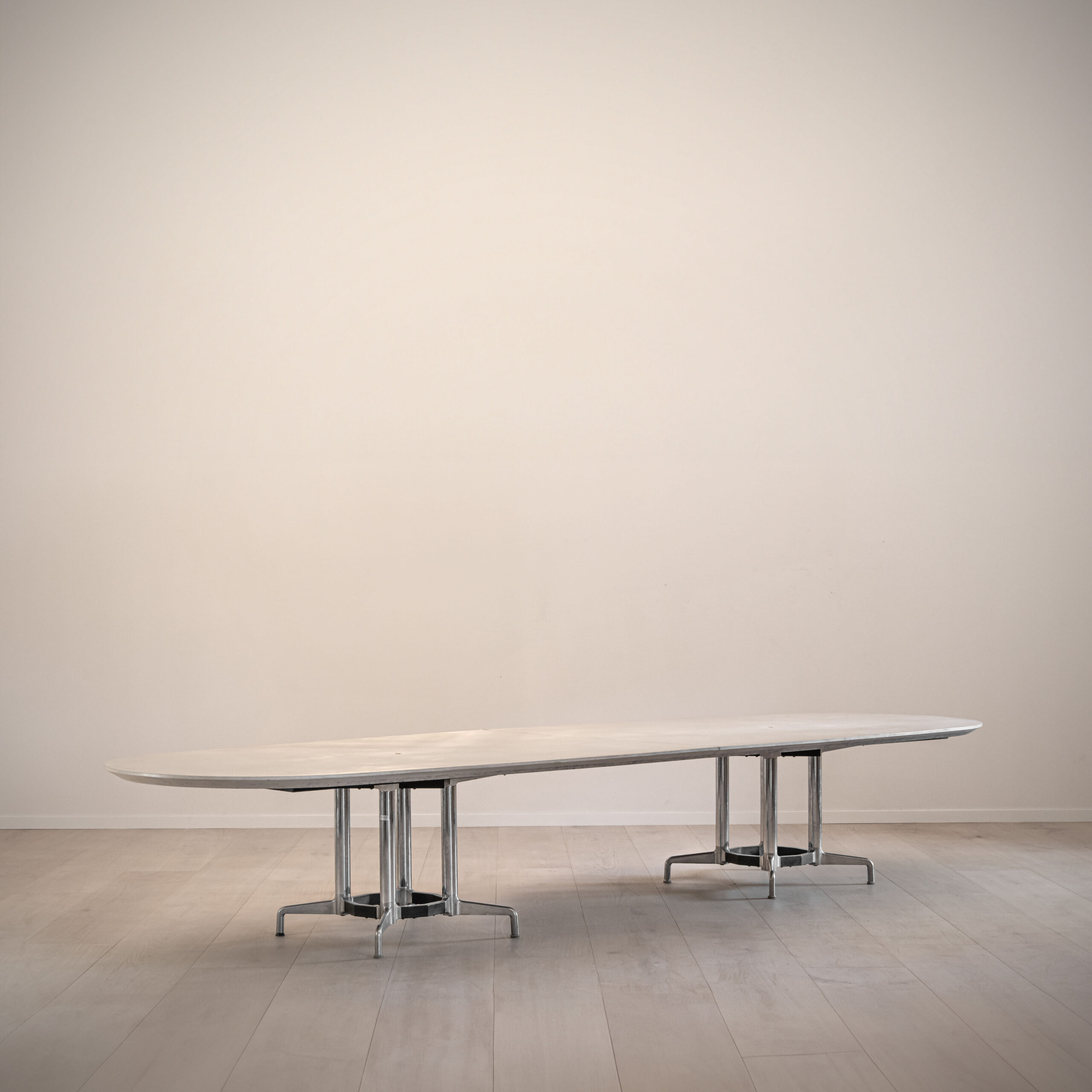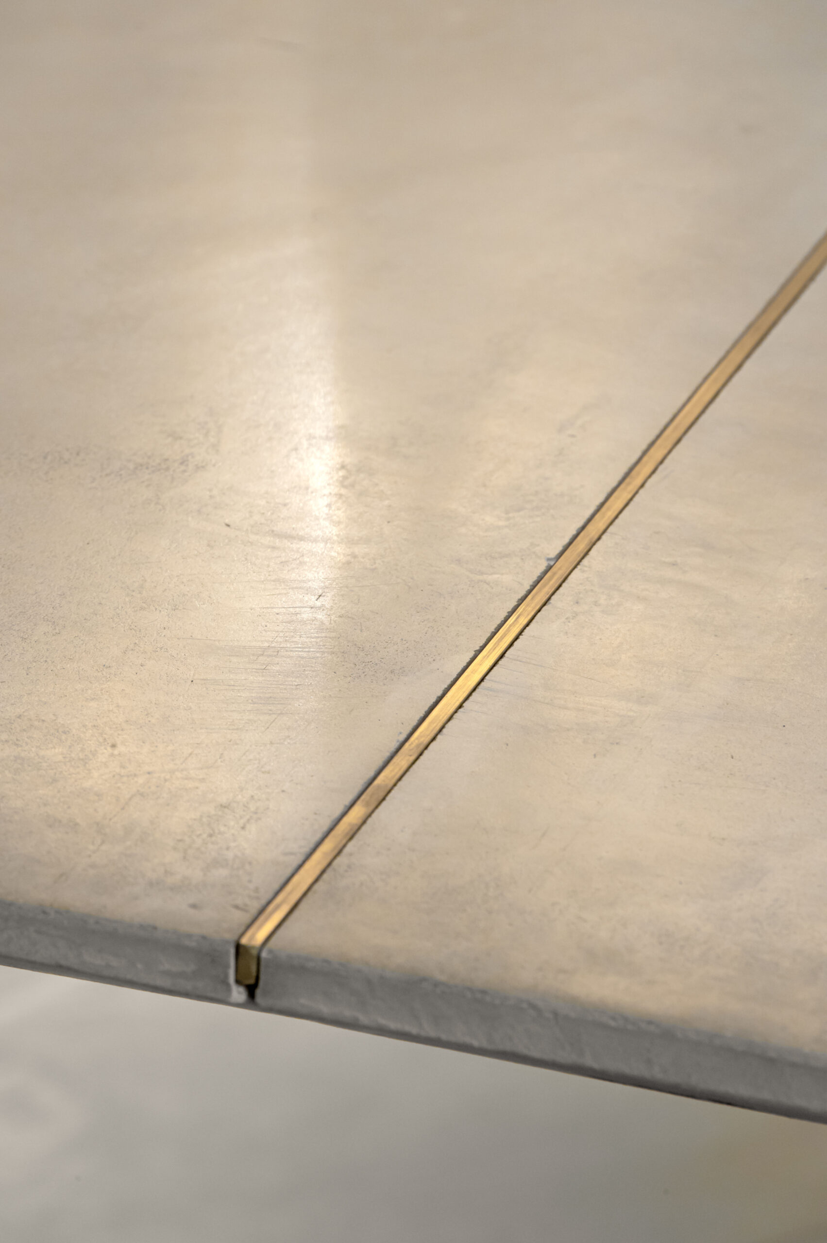 This piece of furniture is the result of our in-house production, a large wooden conference table completely covered with our A\ Fresco technique. The table top is divided into two sections by a flat brass contour that emphasises their union. A small hole is left in the centre to accommodate a lighting system. The characteristic design of the shelf underlines the industrial soul of the piece: two polished metal quadripods, both held together by a circular element in contrasting colours. The chromaticity of the shelf and the reflections of the metal give the whole design a lightness that allows it to harmonise with more intimate and convivial environments.