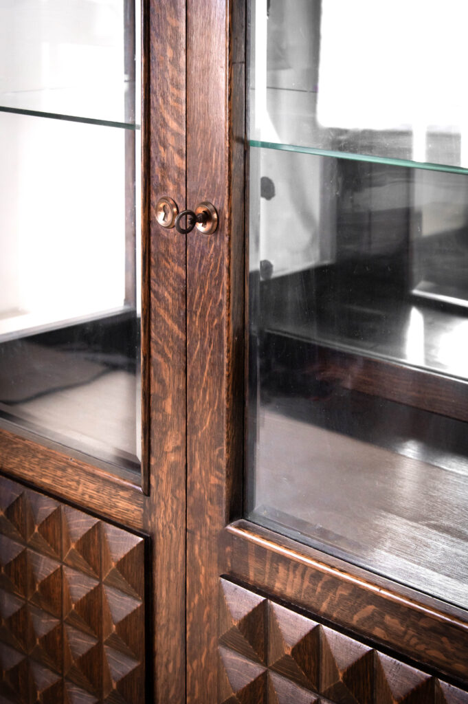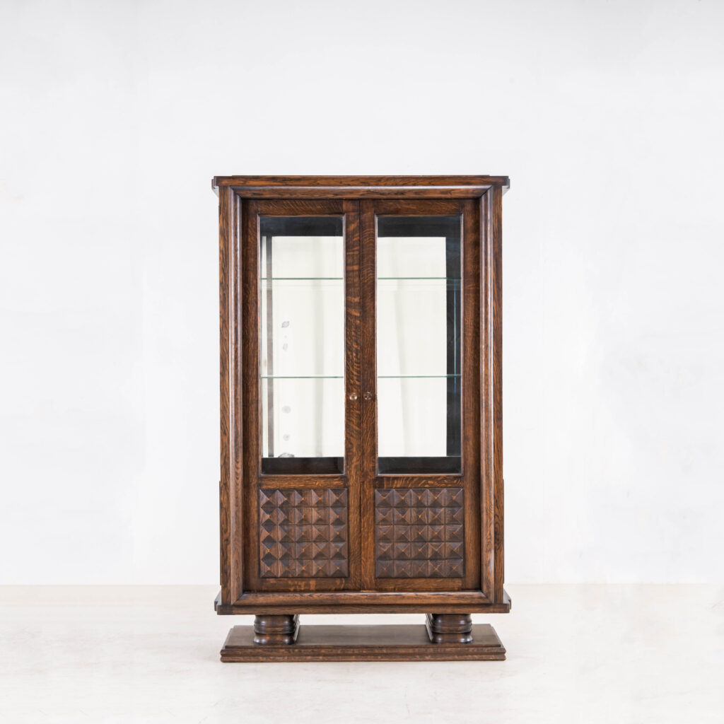 Set of 12 solid oak chairs in pure Brutalist style. Two pairs of rectangular slats, 24 cm for the seat and 16 cm for the back, are the stars of this piece. All the ends have conspicuously rounded corners, giving the impression of a cosy, soft object. To emphasise the contrast, the legs are given solidity by the use of an inferior bevel angle, and the structure as a whole presents itself as a harmonious piece of perfectly fitted solid oak.