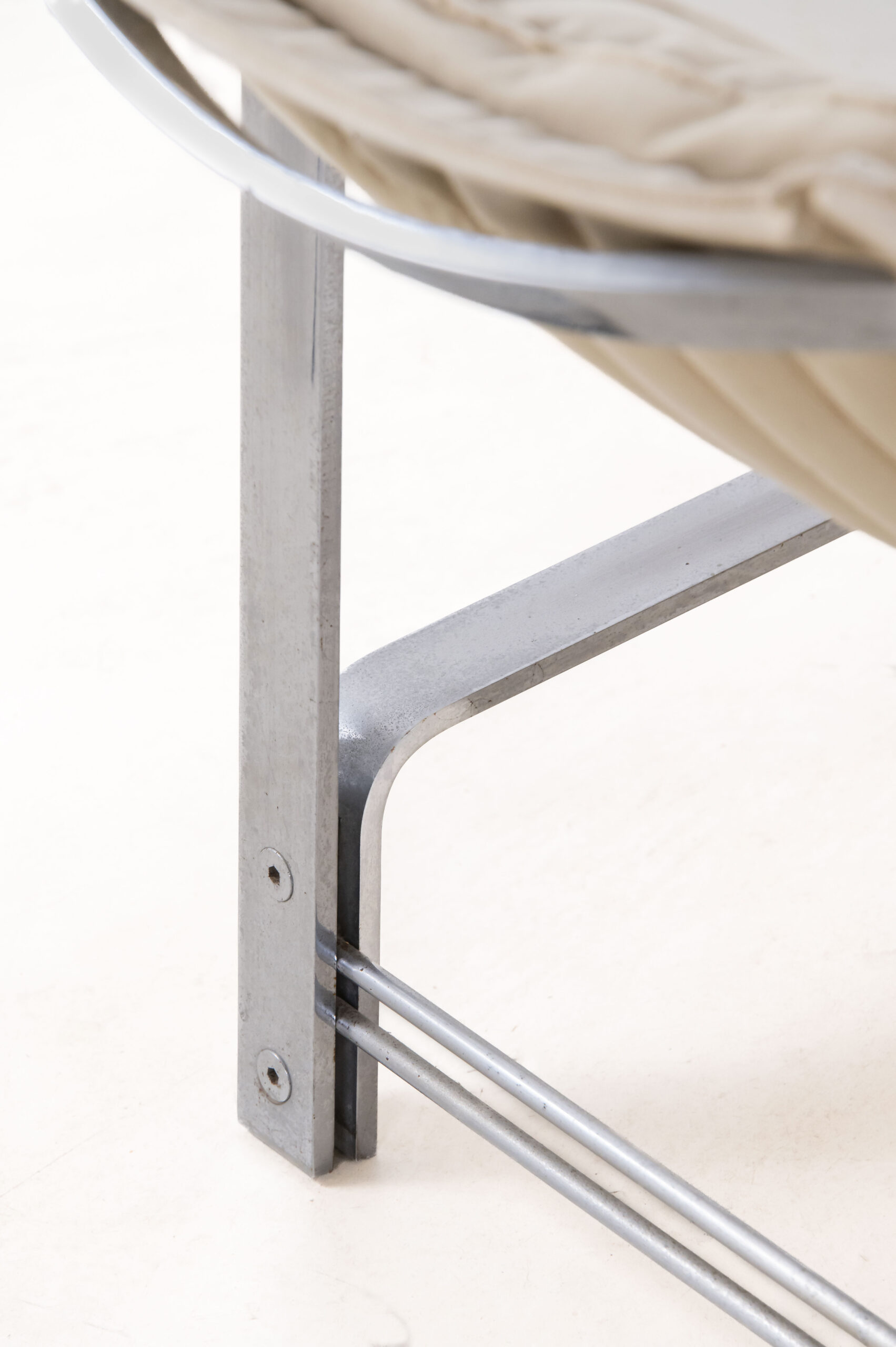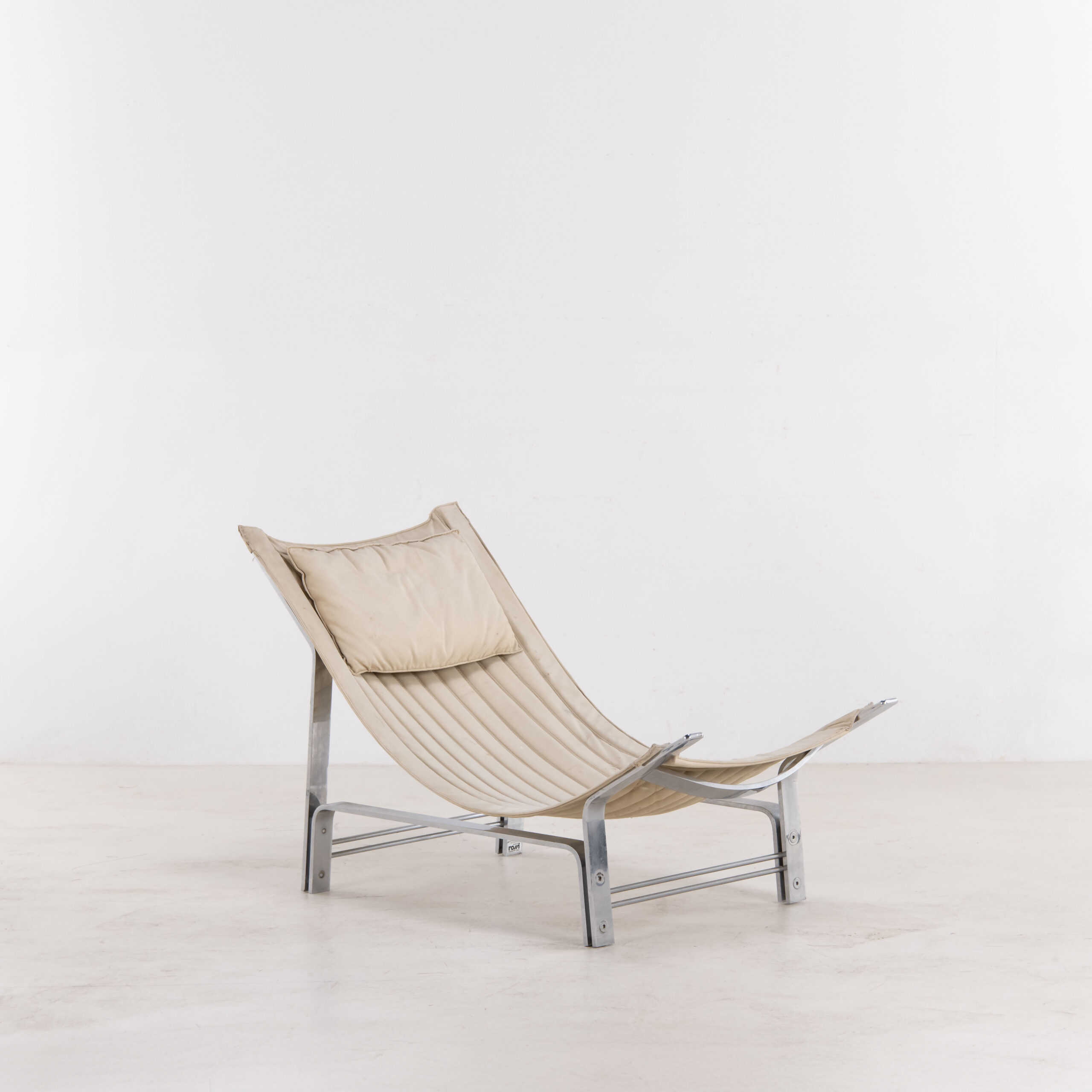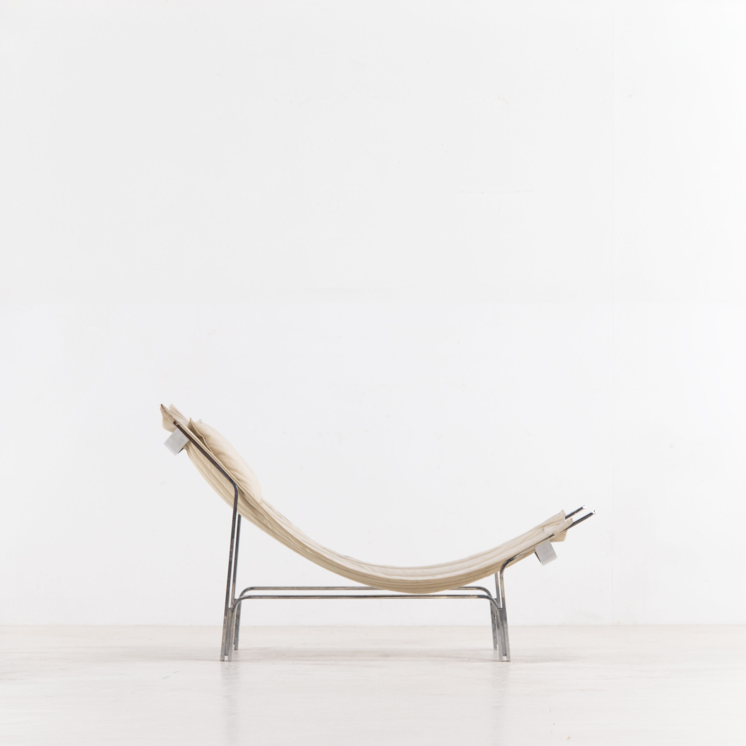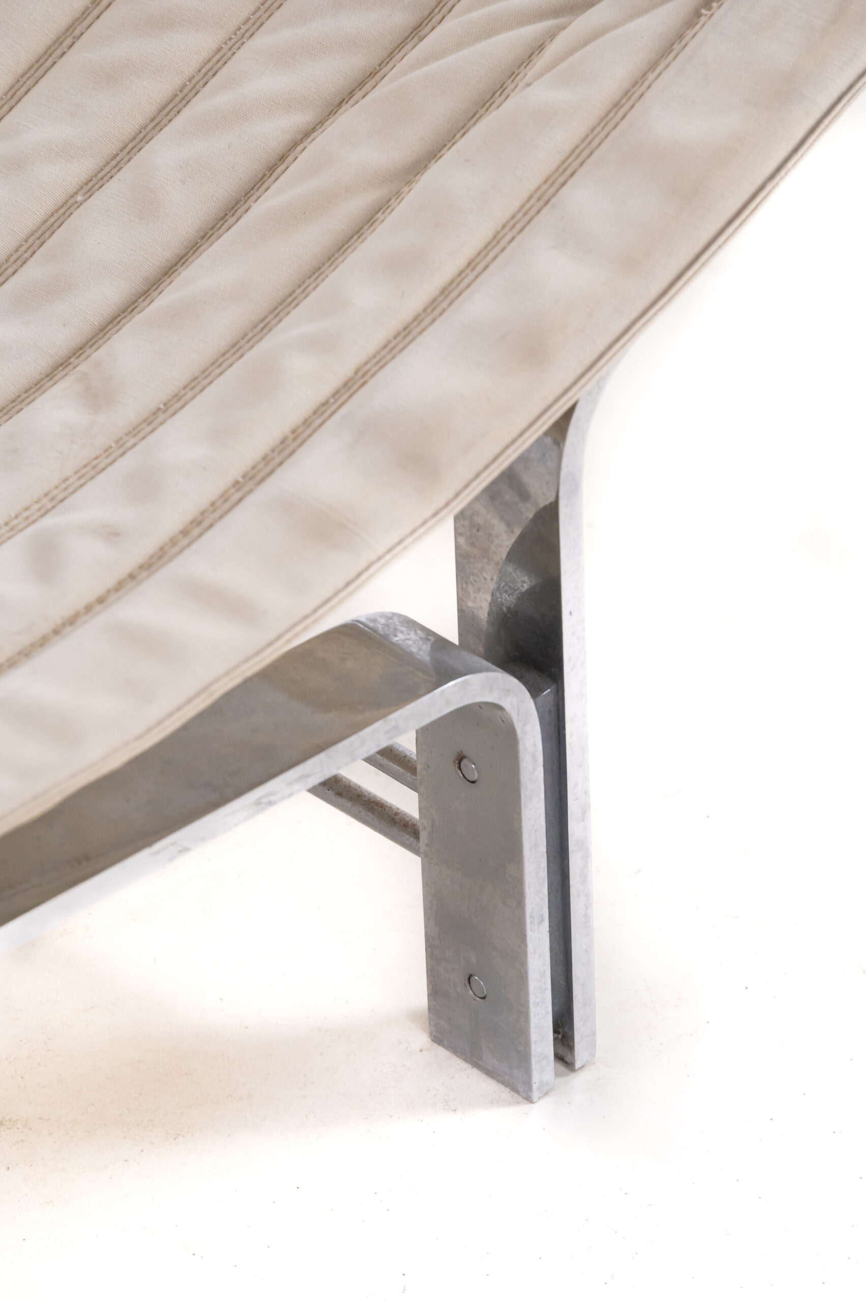 The origins of the chaise longue can be traced back to the Greco-Roman world, where there were beds or sofas with a longer side on which you could lie down and eat. Over the centuries, the chaise longue has evolved and become a common furniture element. In the first half of the twentieth century, furniture using mirrored metal began to appear in homes: in this chair, the metal is inserted into the structure of the base, giving the impression that the upholstery is floating. The beige fabric presents vertical seams at regular intervals and a comfortable cushion is positioned at head height. |