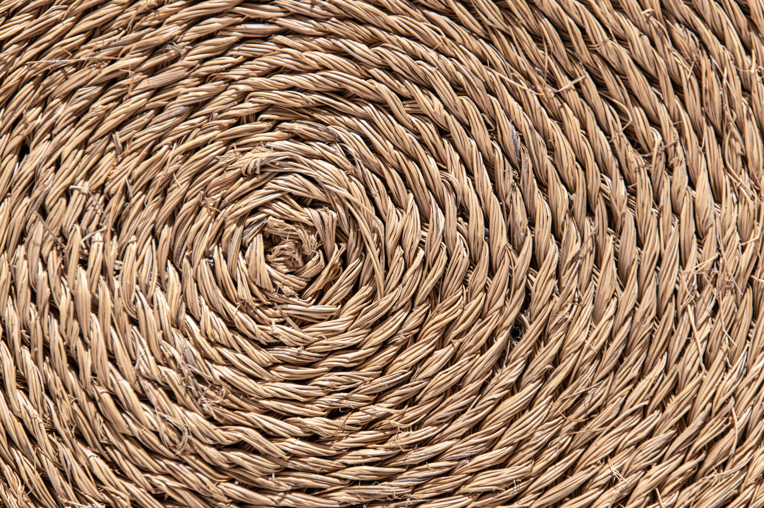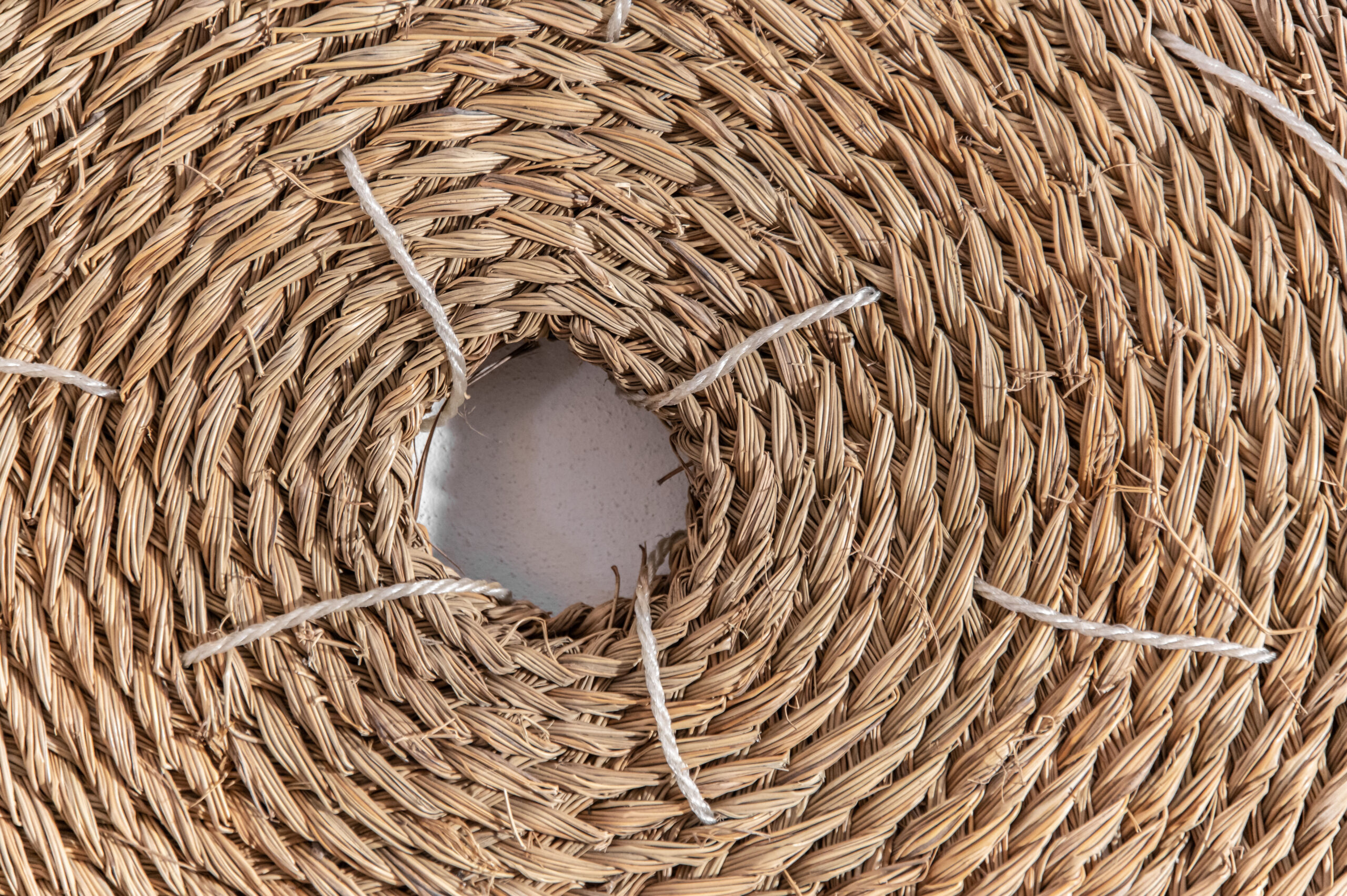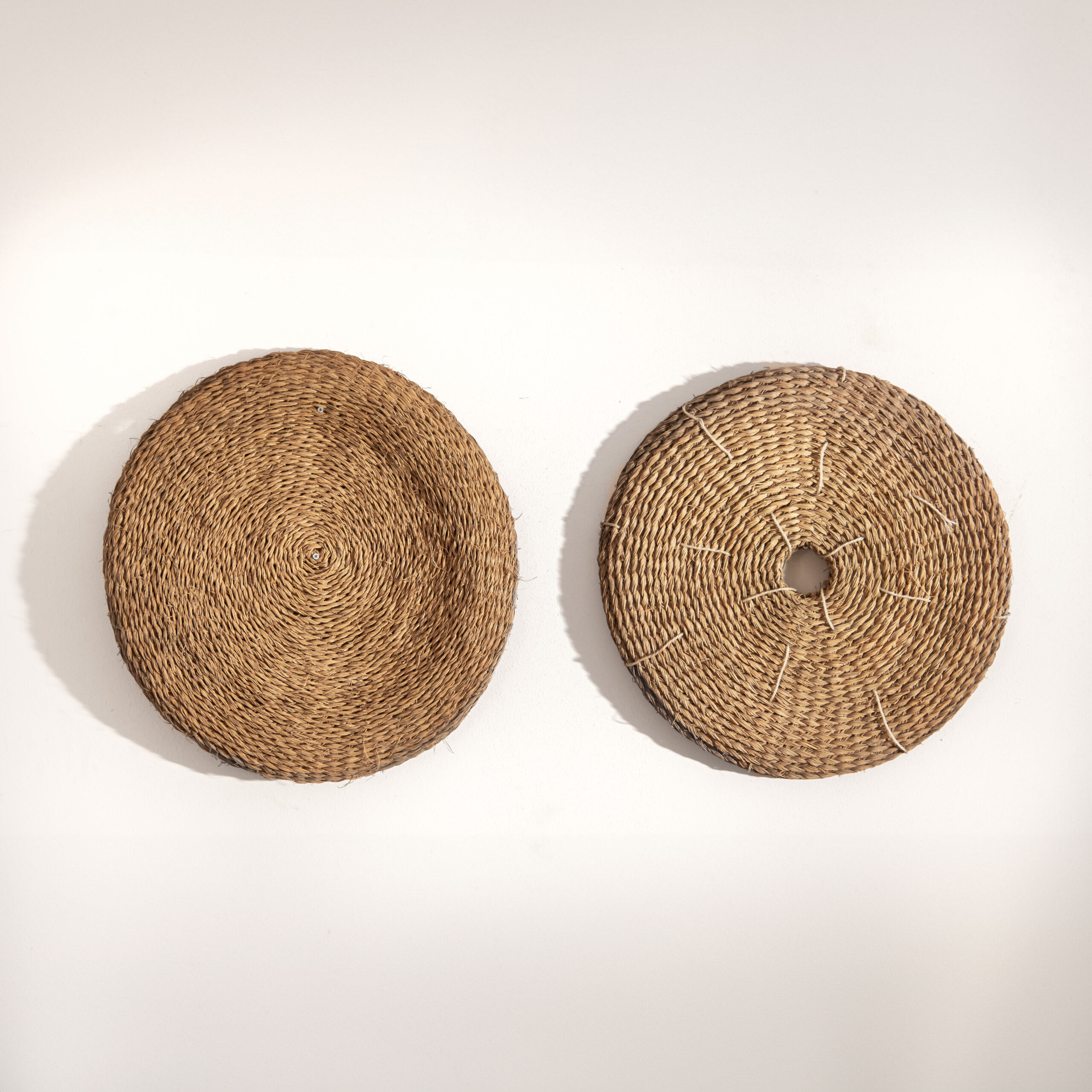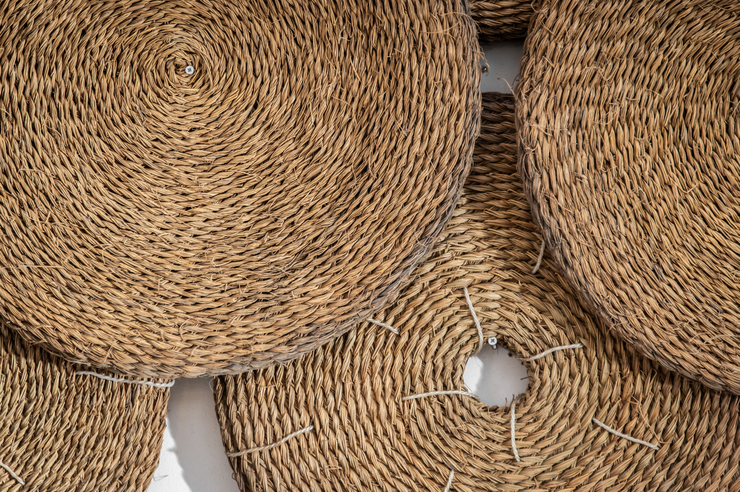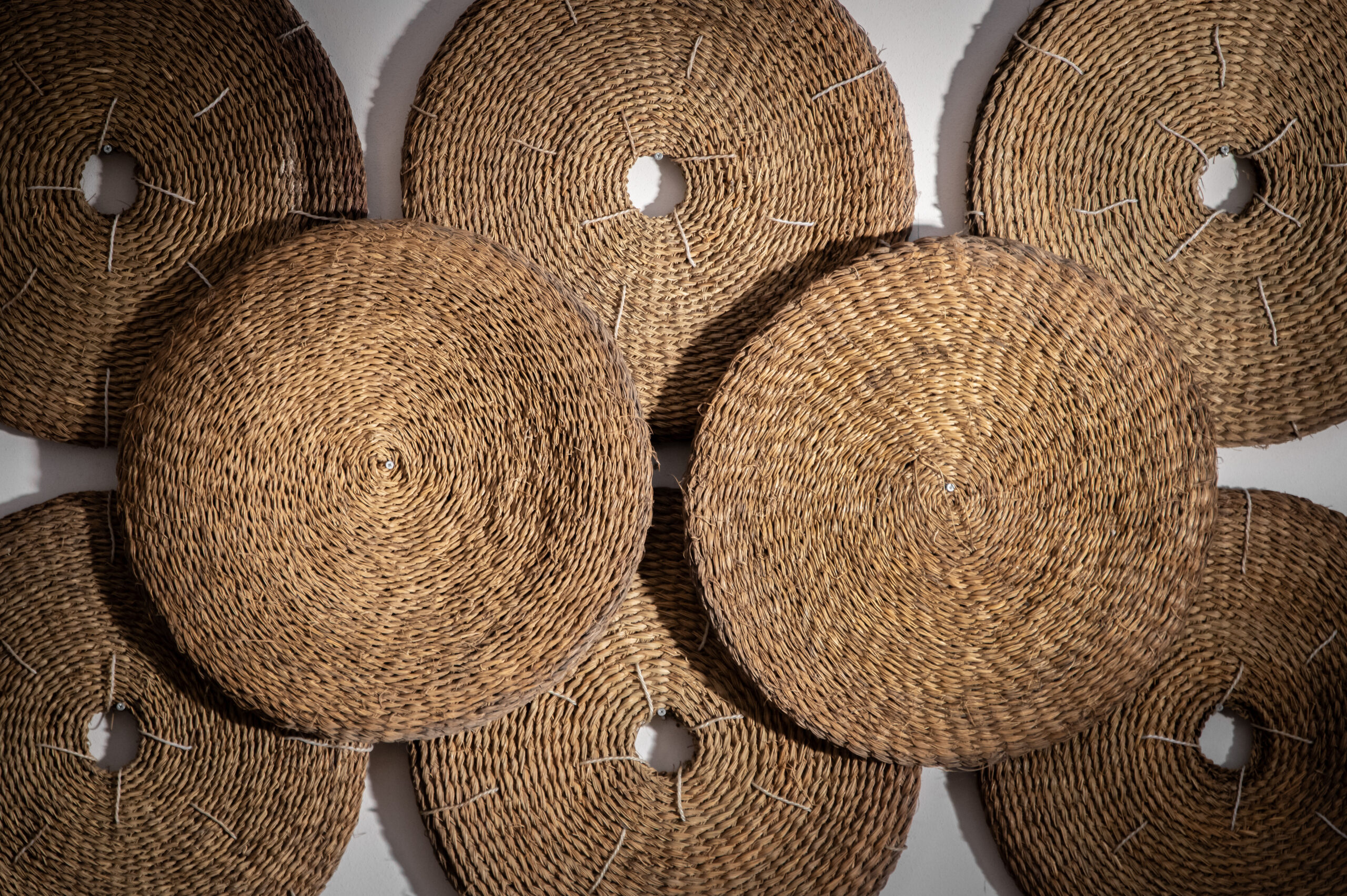 These wicker filters were traditionally used in the olive oil production process to filter the oil from solid residues and water. They were woven with natural wicker or reed fibres around a frame to form a kind of basket or porous container. Today, these elements are reinterpreted as a wall installation, taking advantage of their circular shape and perforated centre to create a geometric work of art.