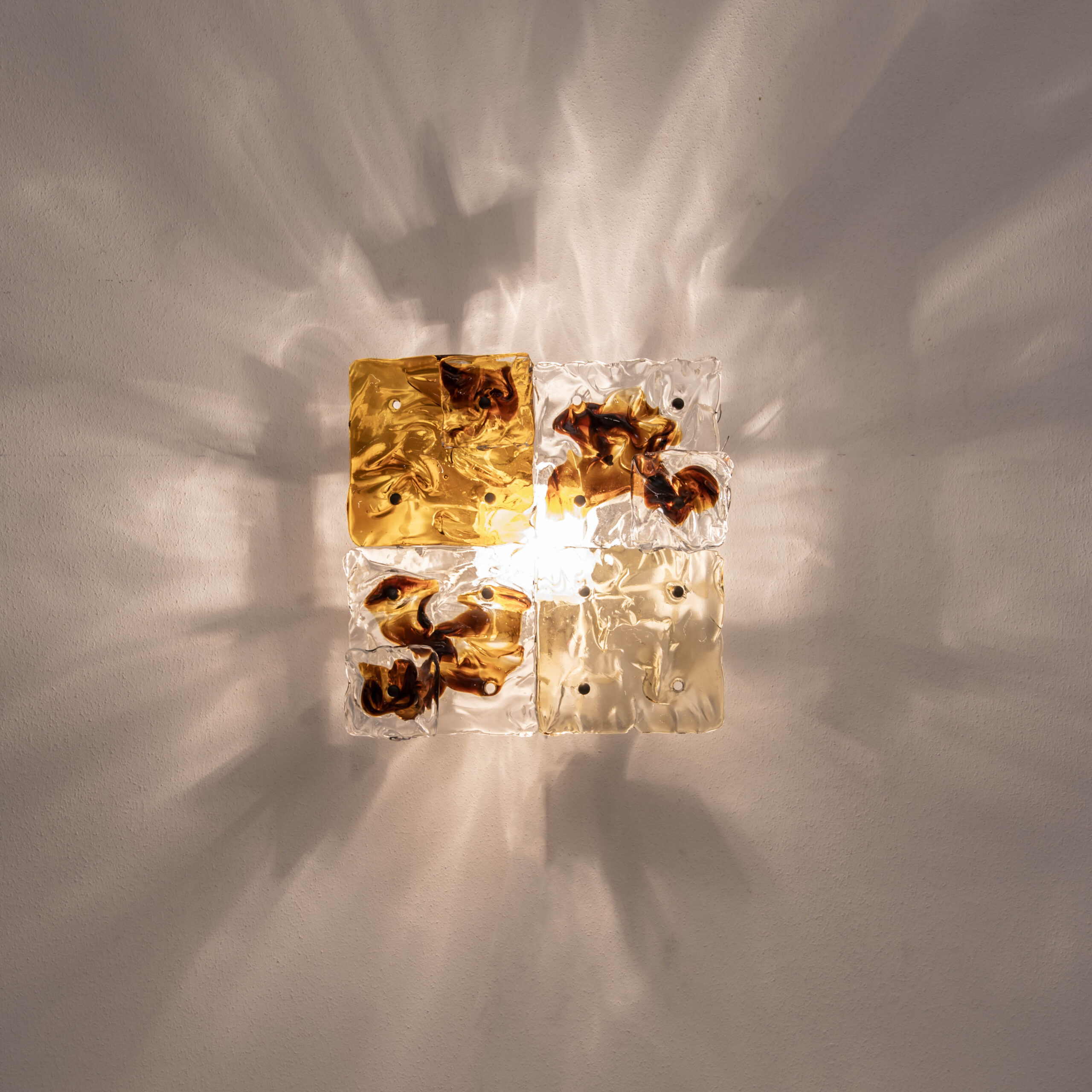 Venini, a surname that itself recalls the story of the Milanese lawyer Paolo Venini and the Venetian antique dealer Giacomo Cappellin, who in 1921 began their entrepreneurial journey by choosing glass as the absolute protagonist of their company. This set of beautiful and very rare wall lamps was designed by Toni Zuccheri for the Patchwork series launched by the company in the 1970s. The lamps are made of heat-treated transparent glass and the frame is in lacquered metal with brass details. The amber tone of the glass defines the true works of art, capable of speaking through light.
