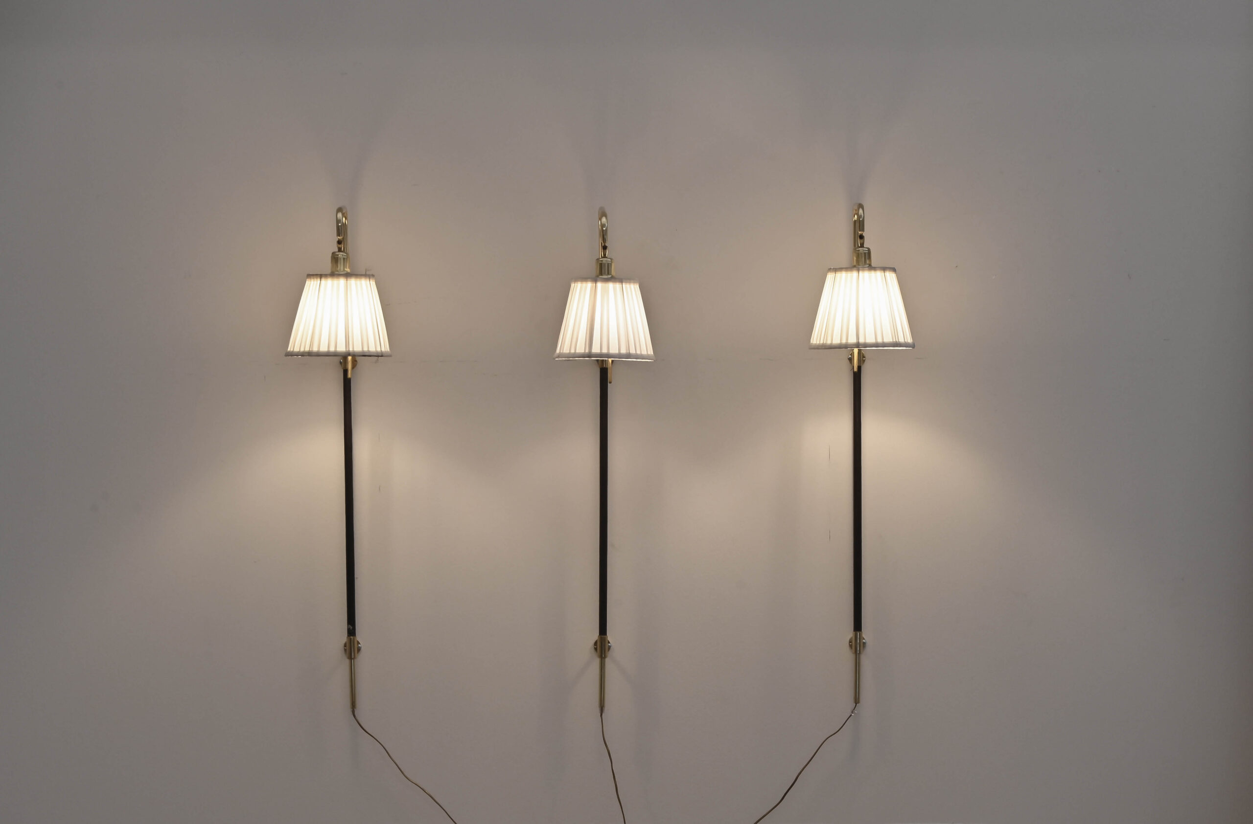 Nel cuore della pittoresca città di Värnamo, in Svezia, sorgeva il maestoso Grand Hotel, un’icona di lusso e raffinatezza. Le pareti degli spazi comuni erano adornate da questo particolare set di applique in ottone e pelle, prodotte da Blond Belysning nel XXI secolo. Ogni applique si compone di una lunga asta rivestita in pelle e ottone, fissata verticalmente alla parete. Le aste, come eleganti lampioncini sostengono il cappello della lampada, che può essere regolato per dirigere la luce. Un semplice pulsante di accensione e spegnimento è discretamente posizionato vicino alla lampadina.