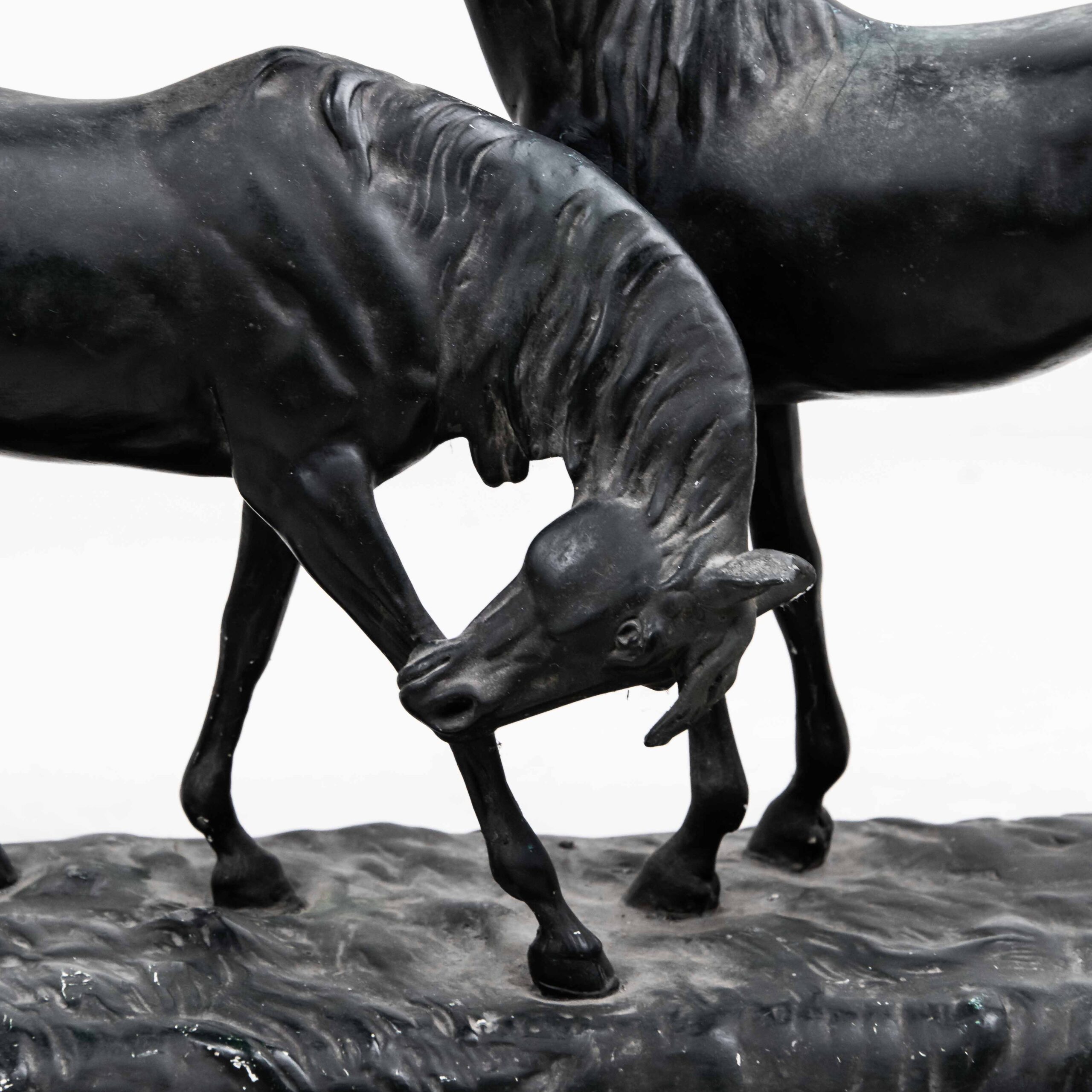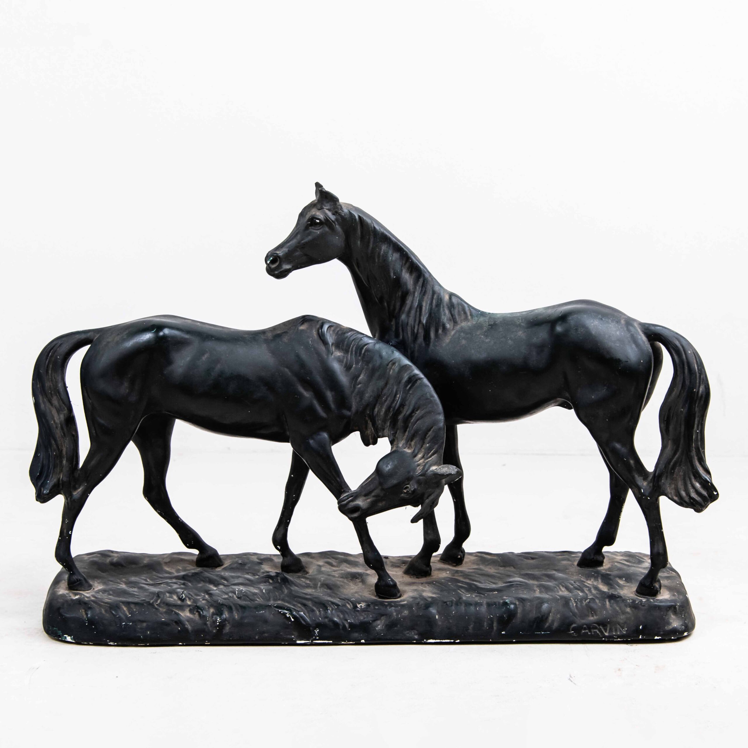 Louis Carvin specializzato nella scultura di animali, prende come modelli cervi, daini, leoni, leonesse, pantere, uccelli, cani lupo, talvolta cavalli, come il gruppo “L’Accolade” tradotto “L’encomio” che rappresenta una coppia di purosangue. Posizionati uno di fronte all’altro, il cavallo di destra tiene la testa eretta mentre quello di sinistra porge un inchino, creando così nella parte centrale dell’opera un perfetto incontro sinuoso. Il pezzo numerato 646 è stato pubblicato dalla fonderia J.B. di Parigi ed è realizzato in bronzo e rifinito con intonaco patinato marrone-nero che gli conferisce un’aura di antica nobiltà. Queste opere d’arte sono più che semplici oggetti, sono pezzi di storia da ammirare e custodire gelosamente.