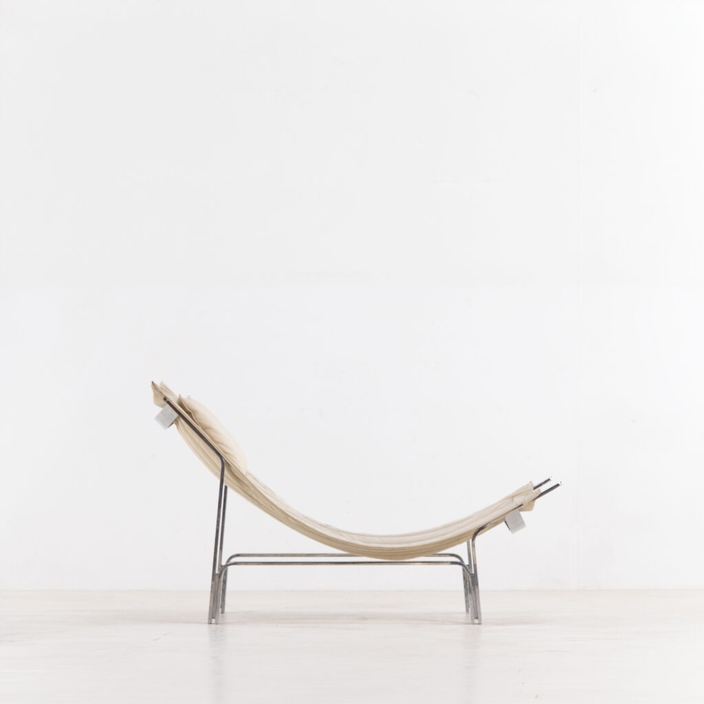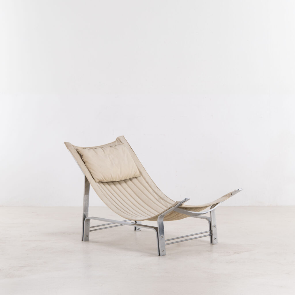 La credenza a cinque moduli che Guido Faleschini ha disegnato per i negozi di Hermès incarna l’eleganza e il prestigio del design francese degli anni ‘70. Gli sportelli della credenza possono essere pieni o in trasparenza grazie all’impiego del vetro fumè. Lungo tutti i bordi il mobile è rifinito da dettagli metallici argento, che ne vanno a scandire i profili e il numero dei cassetti dell’elemento centrale. L’argento viene ripreso nel dettaglio della maniglia, apparentemente classica dalla forma circolare ma che viene resa unica dalla combinazione con un occhiello in pelle: la rigidità dell’anello in argento si sposa con la malleabilità della pelle creando un sistema di apertura caratterizzante. Il rivestimento dei piani d’appoggio in marmo scuro con venature grigie aggiunge un tocco di raffinatezza e lusso, rendendo questa credenza un’icona di stile senza tempo.