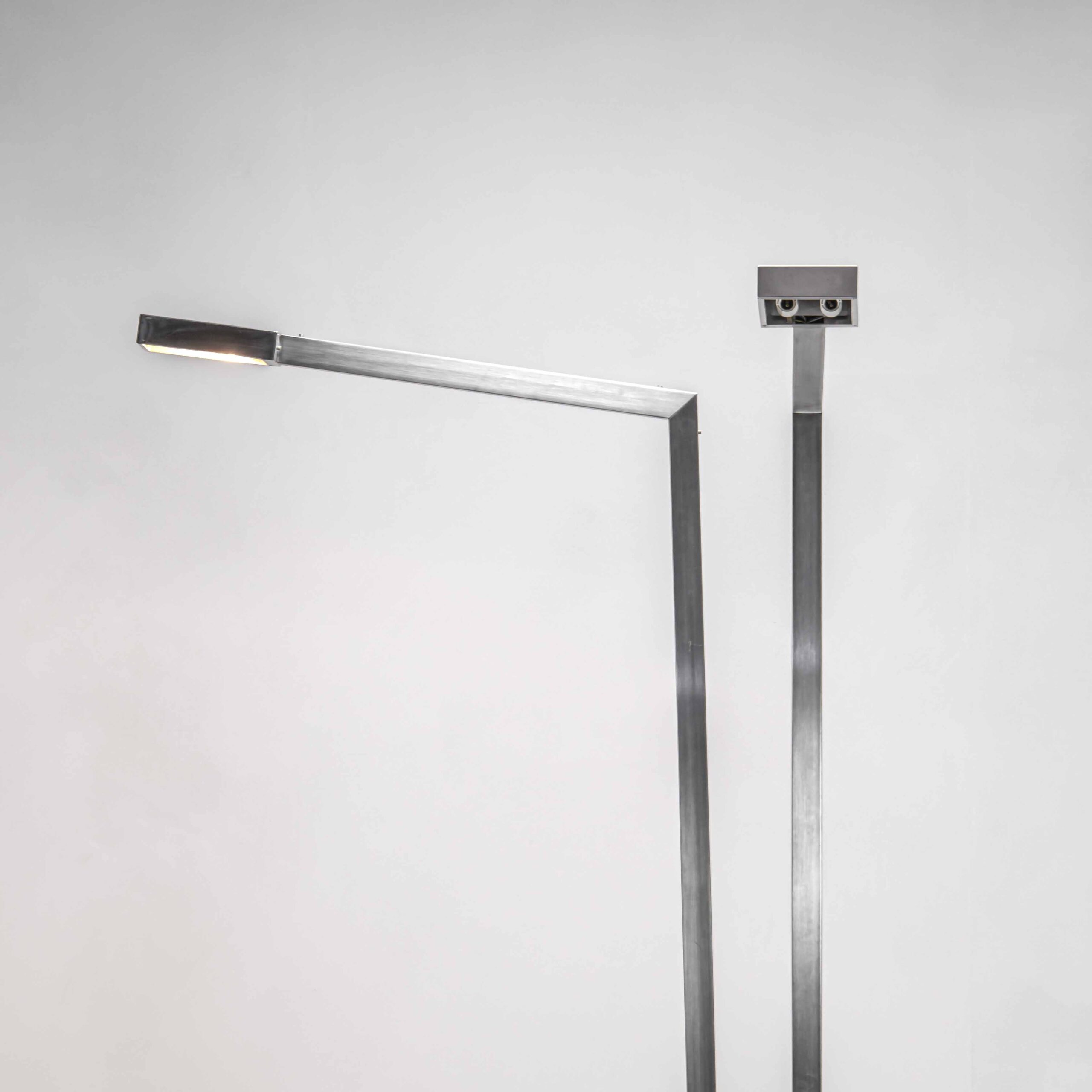 Lampada da terra con struttura ad L generata dall’unione di estrusi in alluminio rettangolari. Nei punti di giuntura troviamo viti al posto di saldature che avrebbero sporcato la linearità dell’oggetto. La piantana è composta da un parallelepipedo a base rettangolare dalle dimensioni contenute, suggerendoci la leggerezza del resto del pezzo. L’incasso a scatola previsto per le luci si trova all’estremità superiore della L e si propone nello spazio con precisione chirurgica. L’intera lampada è in alluminio color naturale con finitura spazzolata.
