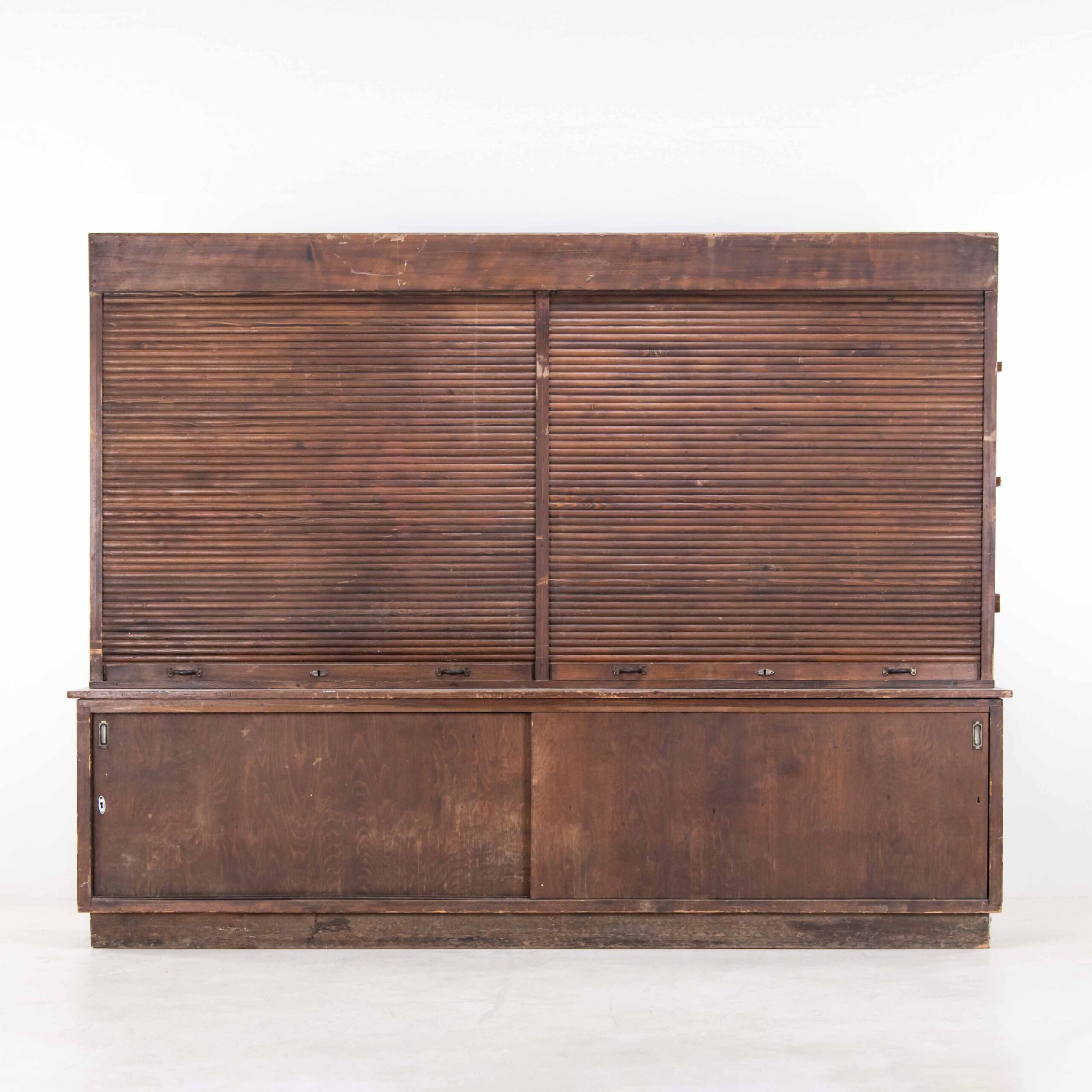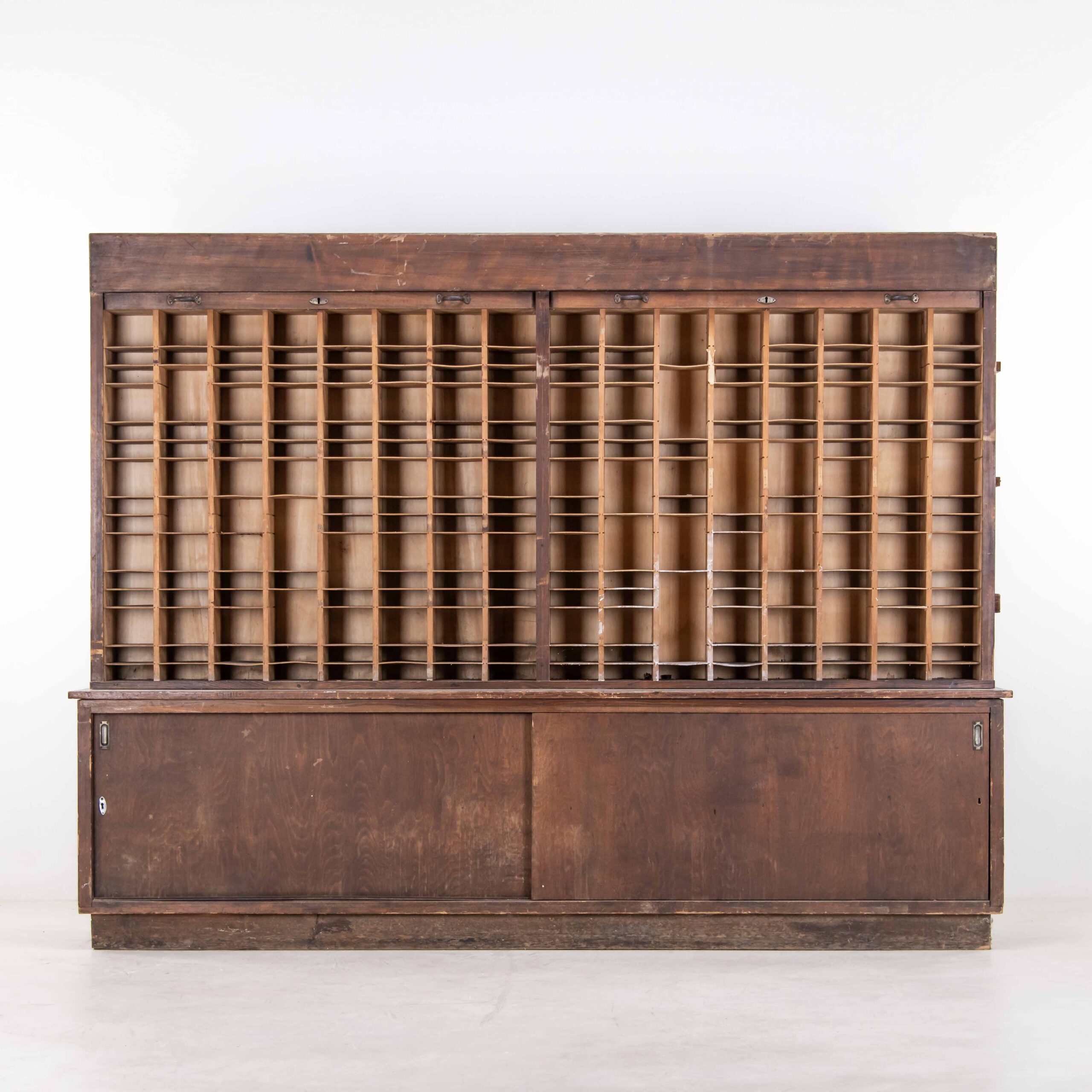 Scaffali pieni di prodotti da esporre e selezionare, questo mobile da farmacia raccoglie in se il significato più profondo dell’espressione “prendersi cura”. Alla base un ampio spazio con ante scorrevoli e la parte superiore, alta il doppio della base, è divisa e ritmata da piccole sezioni e colonne, pronte ad accogliere l’inventario. Un sistema a basculante diviso in due sezioni e munito di maniglie permette di chiudere frontalmente gli scompartimenti, proteggendone il suo contenuto. La possibilità di inserire questo elemento in un contesto living lo rende un raccoglitore di storia a cui rivolgere un’espressione incuriosita e affascinata.
