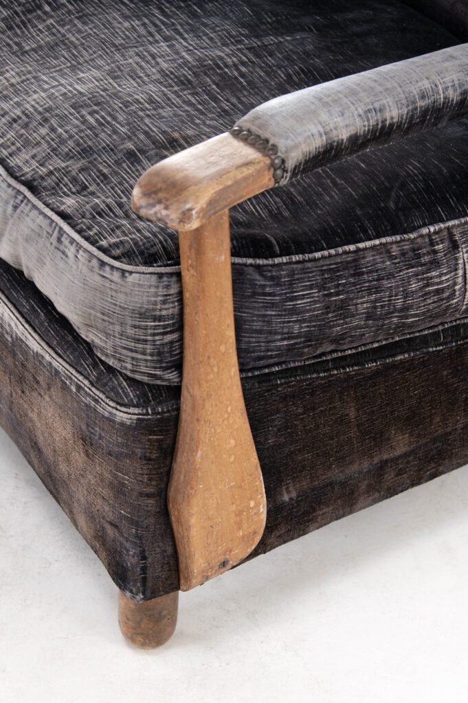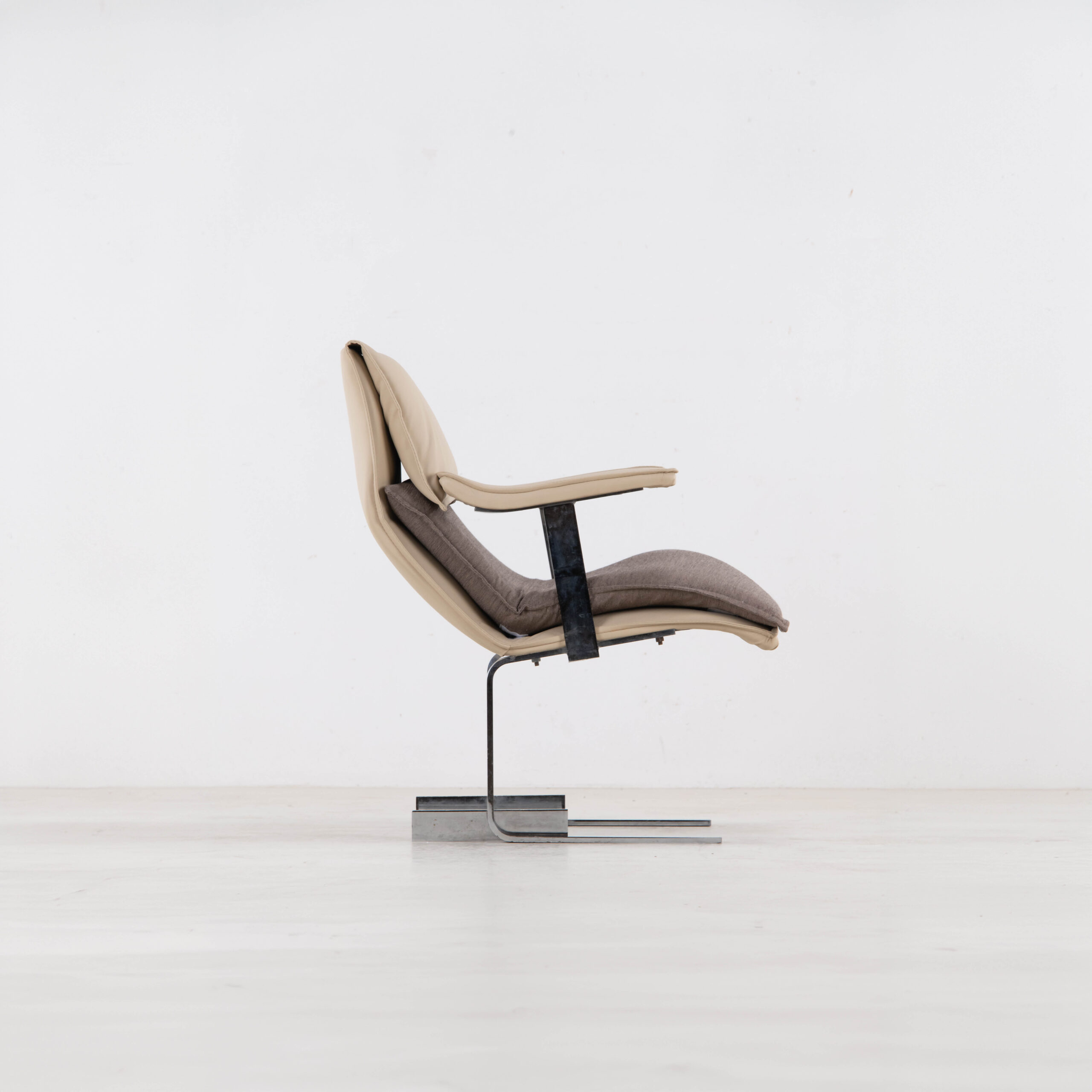riveste in un unica volta la forma sinuosa della seduta e lo schienale. La stessa pelle viene impiegata anche per rivestire ed imbottire i braccioli. Proprio come un sistema a federa, viene fatto avanzare dalla parte dello schienale un lembo di pelle, che ripiegandosi su se stessa crea un cuscino per la parte superiore di testa e spalle. Un altro imbottito color tortora viene aggiunto alla seduta per renderla ancora più confortevole. La struttura è bilanciata alla base grazie ad un disegno che unisce le gambe a sbalzo a sezioni rettangolari di acciaio, che si allunga posteriormente.