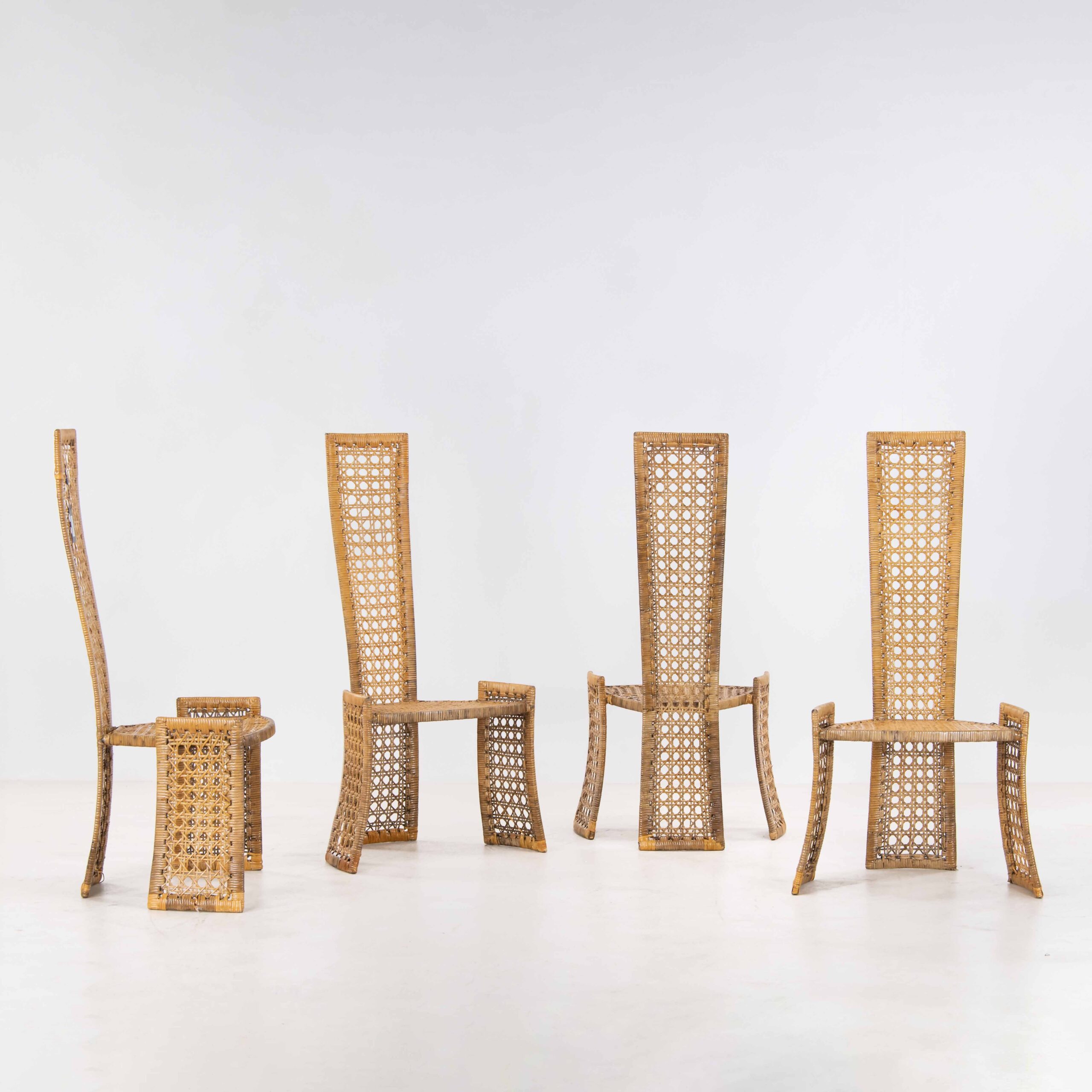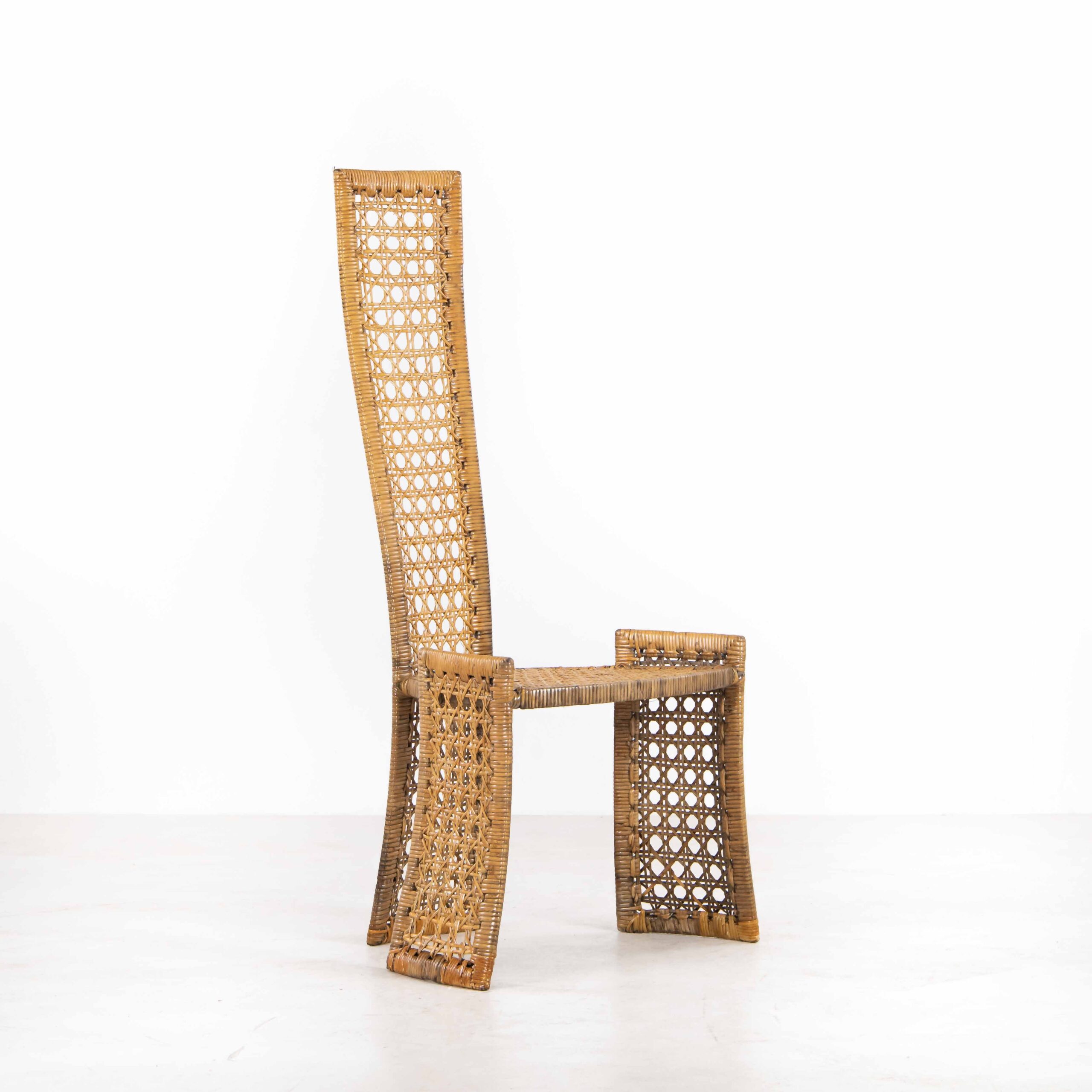 Artigianalità, uso sapiente dei materiali e funzionalità, tre aspetti a cui il designer e architteto Marzio Cecchi si dedicava. La sedia da lui disegnata, realizzata in bambù e paglia di vienna ci comunica leggerezza e raffinatezza. Lo schienale alto conferisce eleganza e comfort ergonomico, rendendo questa sedia adatta per l’uso quotidiano. Nonostante l’aspetto maestoso gli elementi laterali del tripode sono armonizzati con il resto della struttura riproponendo la forma rettangolare dello schienale.