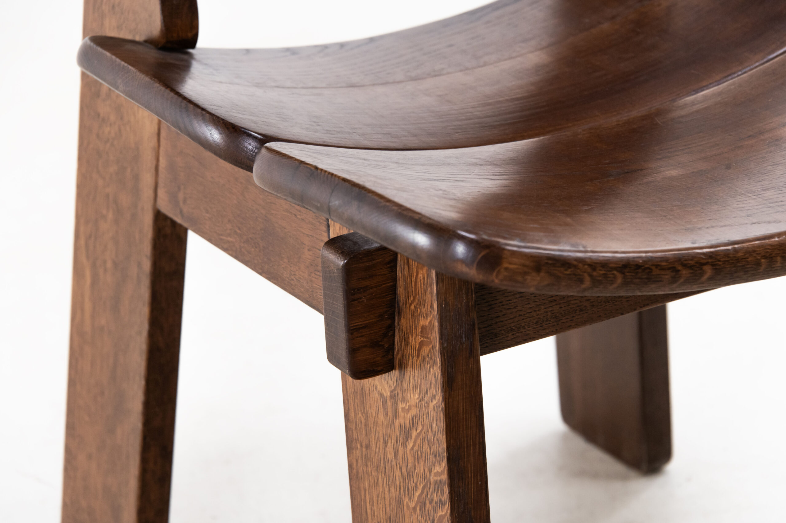 Set di 12 sedie in rovere massello in puro stile brutalista. Due coppie di doghe rettangolari, rispettivamente 24 cm la seduta e 16 cm lo schienale, sono le protagoniste di questo pezzo. Tutte le estremità hanno un angolo di stondatura evidente, regalando la sensazione di un oggetto accogliente e morbido. Per enfatizzare il contrasto alle gambe viene conferita solidità usando un angolo di smusso inferiore, la struttura nel suo complesso si presenta come un unico armonico pezzo in rovere massello perfettamente incastrato.