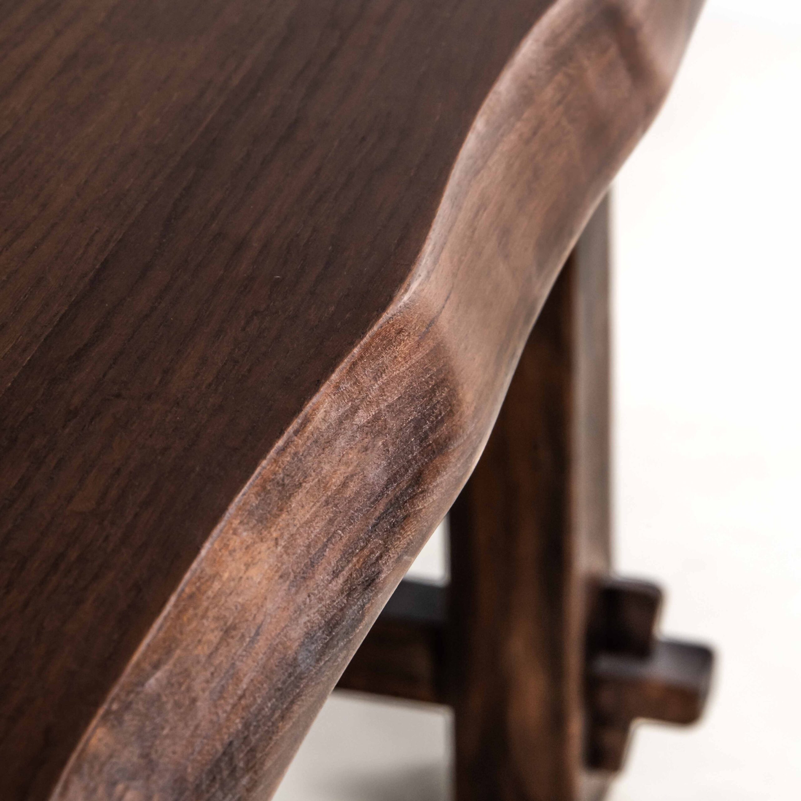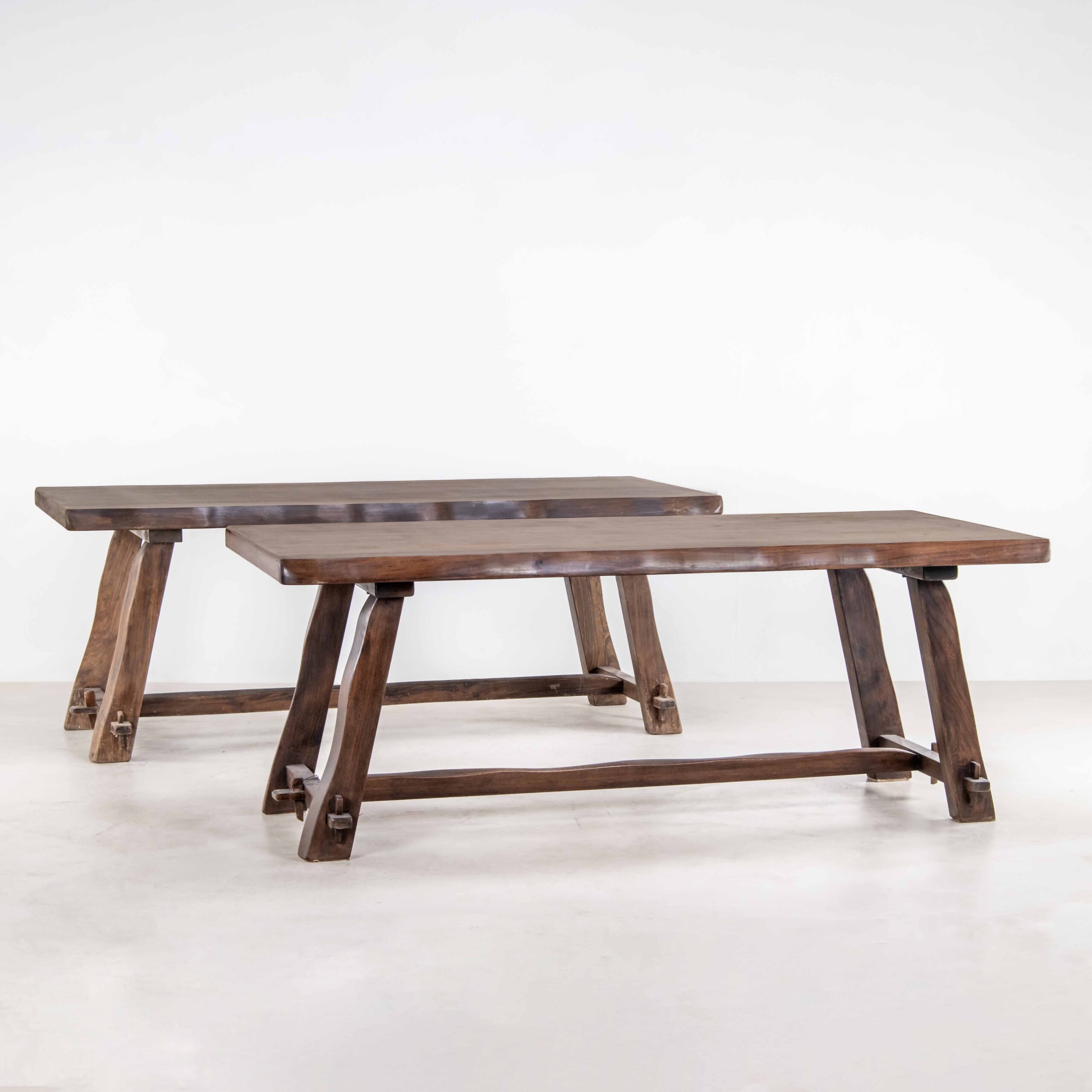 Questo tavolo da pranzo è opera del design finlandese degli anni ‘60. Si ispira ad un progetto di Olavi Hanninen: unisce forme organiche e materiali naturali in un incastro armonioso. Conosciamo questo pezzo in rovere massello facendo correre la mano lungo i suoi bordi irregolari e ne apprezziamo il carattere deciso. Le quattro gambe del tavolo sono unite tramite degli assi di legno tra di loro perpendicolari che incastrandosi come un puzzle evitano la necessità di usare altro materiale diverso dal legno.