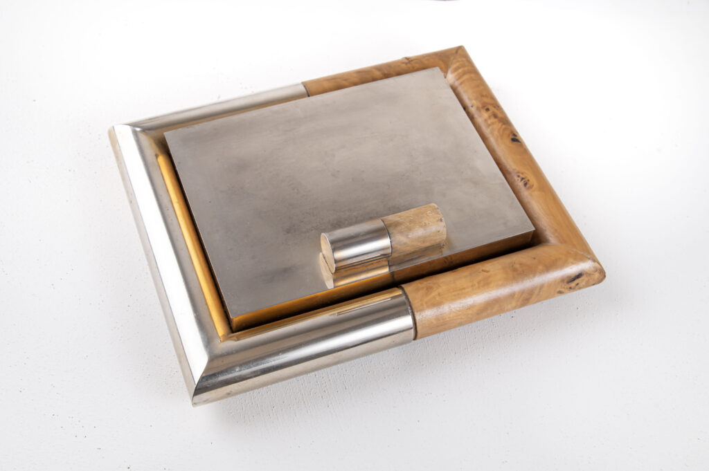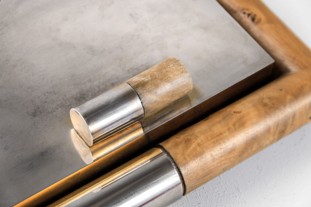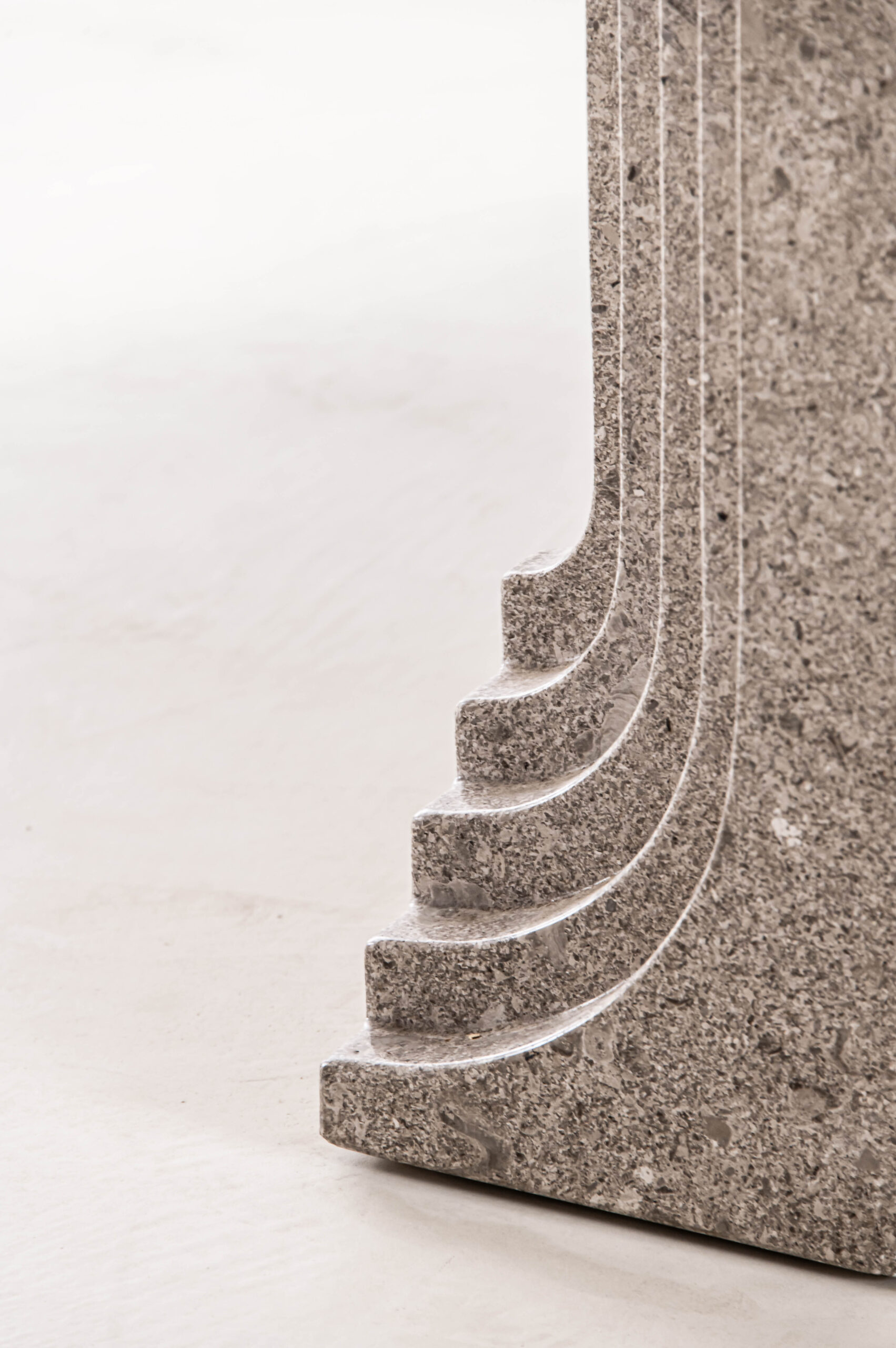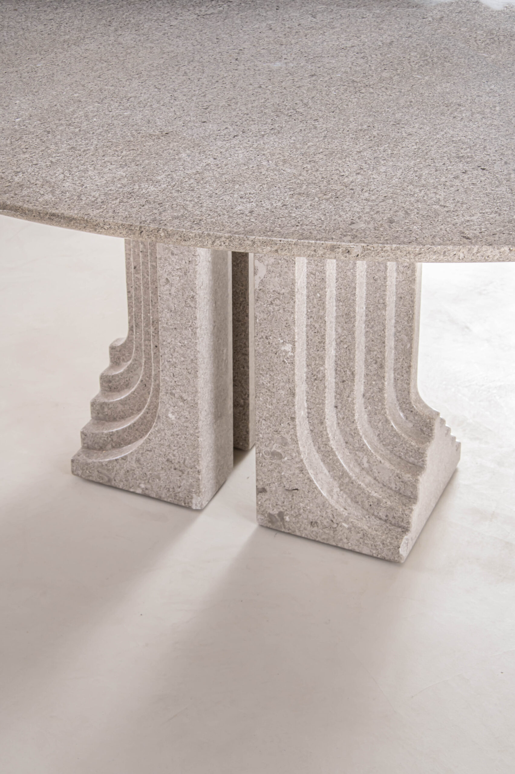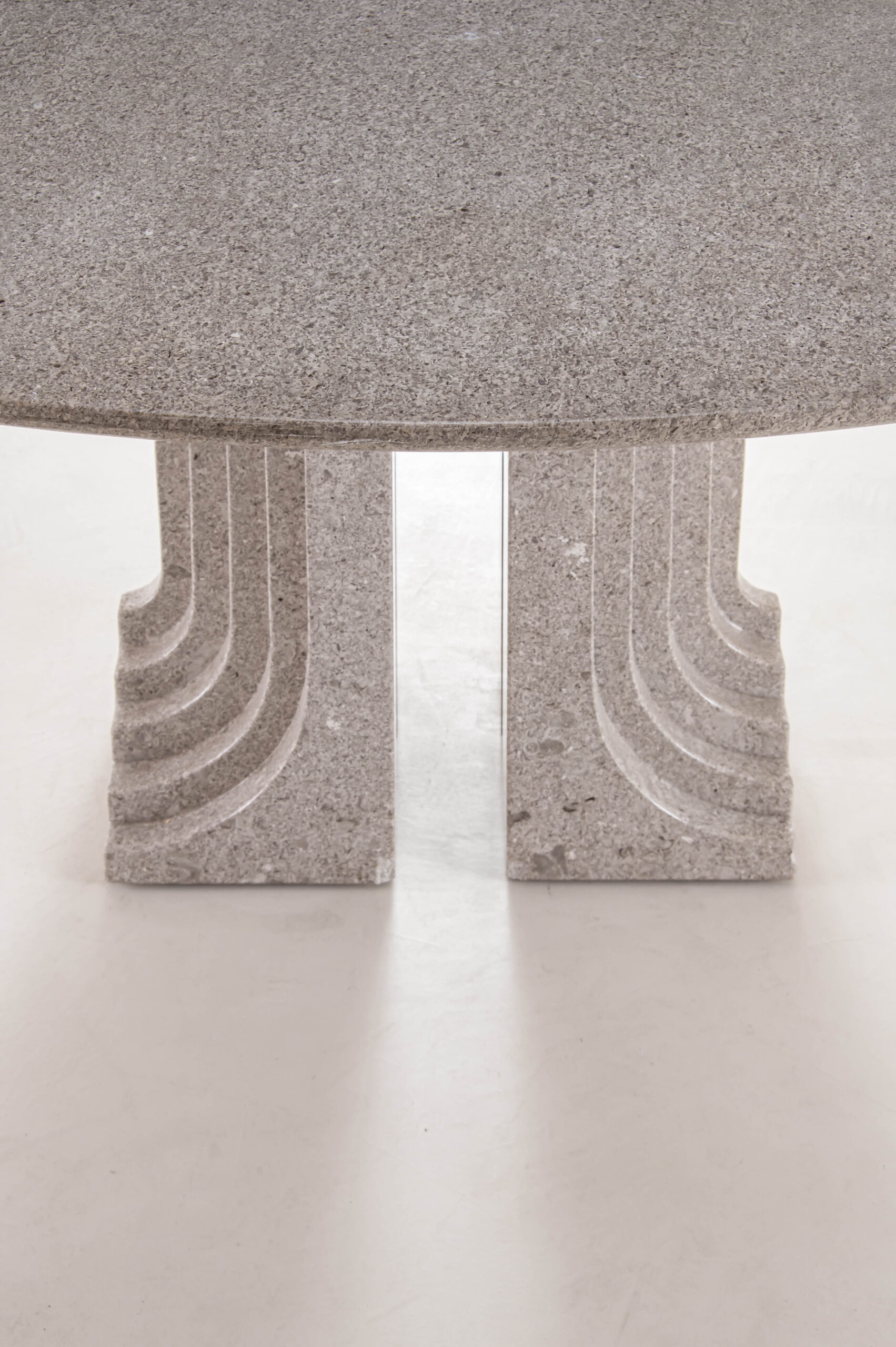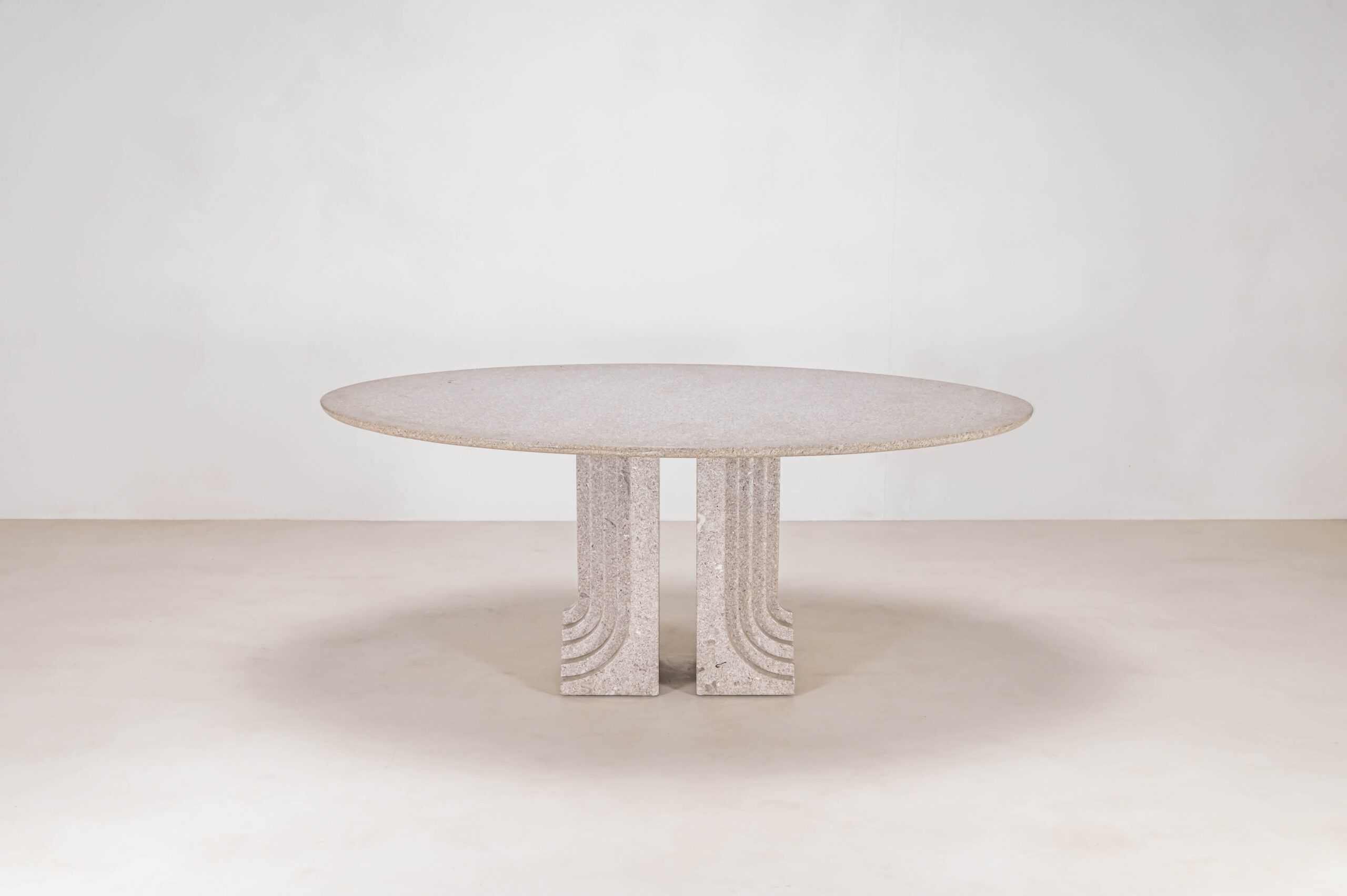 Negli anni ‘70, l’Italia è stata testimone di un’ esplosione creativa nel mondo del design, uno dei suoi protagonisti era Carlo Scarpa. Tra le sue opere più iconiche spicca il tavolo da pranzo “Samo”, parte della collezione “Ultrarazionale” di Simon. Si distingue per le sue gambe architettoniche, evocative delle colonne romane, realizzate in granito grigio: Il granito stesso è arricchito da piccoli fossili e conchiglie, che conferiscono alla pietra una luce delicata e suggestiva. Il design del “Samo” rappresenta una reazione decisa all’ampio utilizzo del poliestere nel design dell’epoca. Il tavolo, con il suo piano ovale sostenuto da gambe massicce, stabilite saldamente tramite quattro tasselli, trasmette un senso di robustezza straordinaria nonostante le proporzioni.